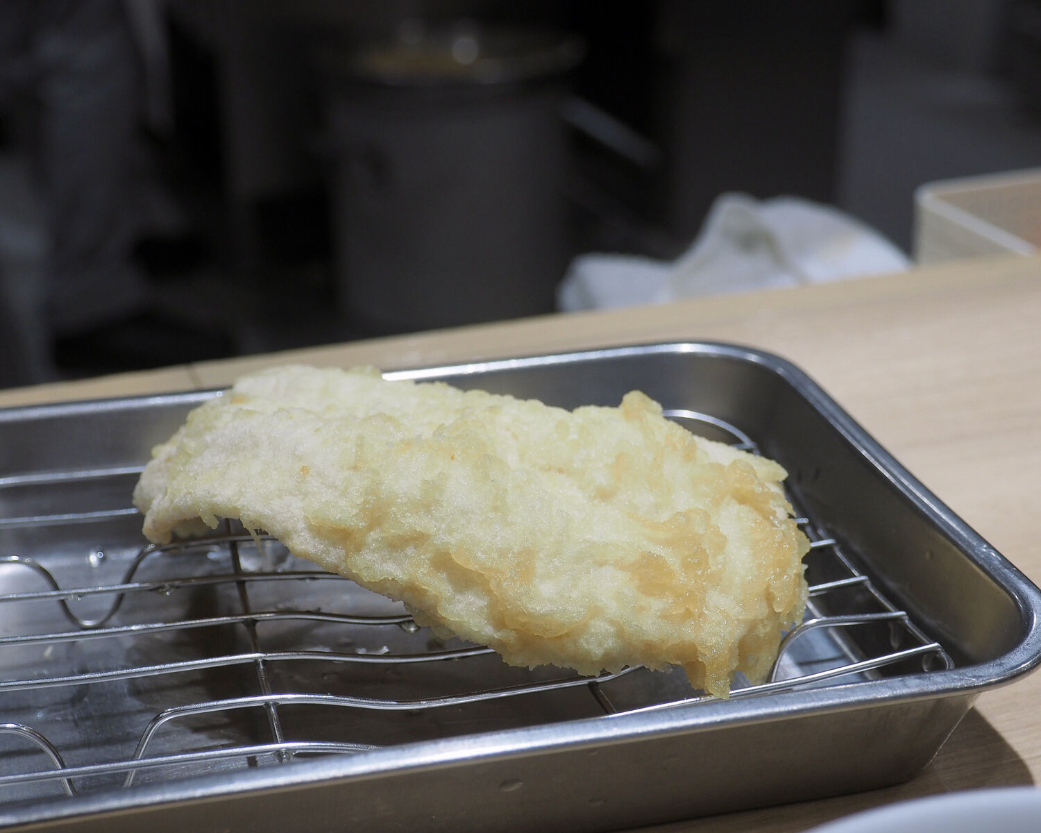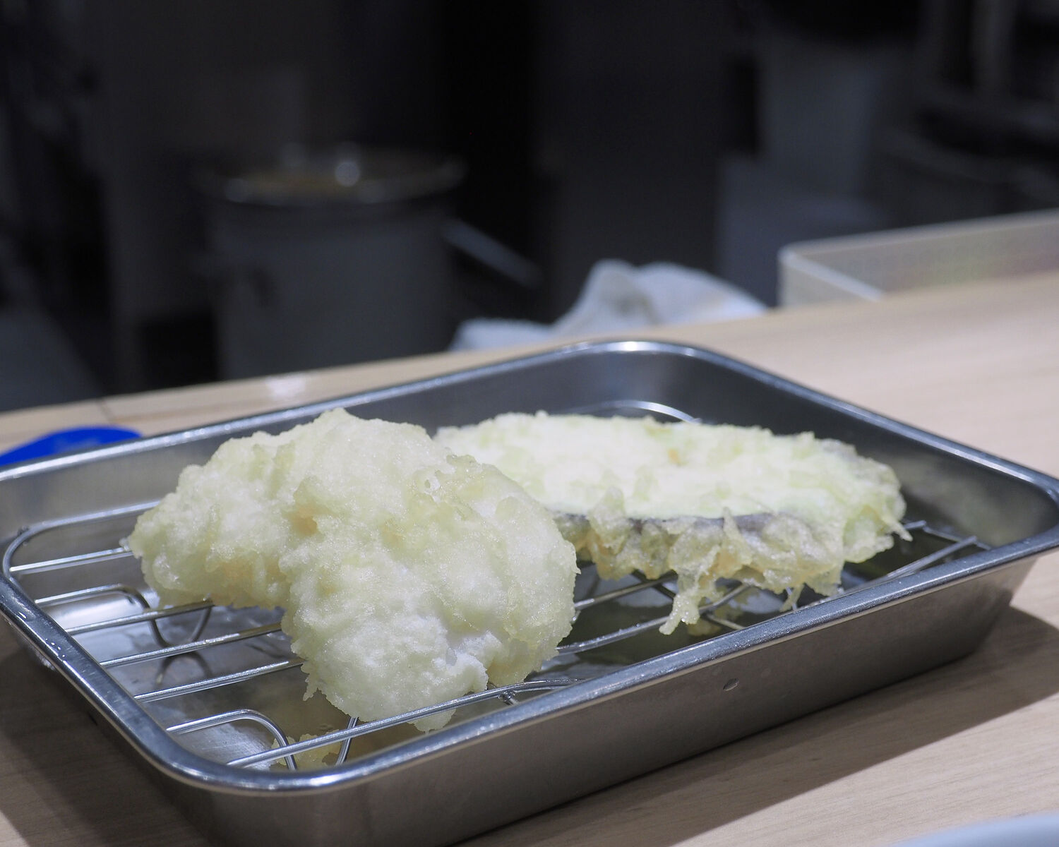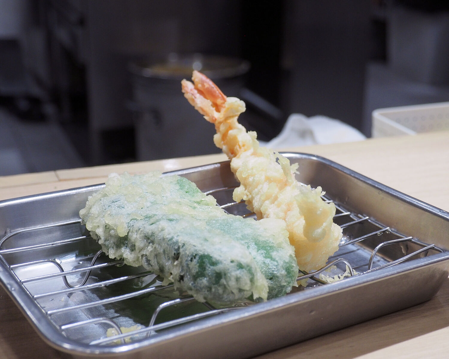 こちらの天ぷらは一皿に盛られて提供されるのではなく、タネひとつ一つの揚げたてを卓上に準備されたステンレスの油切り皿に提供してくださるのであります