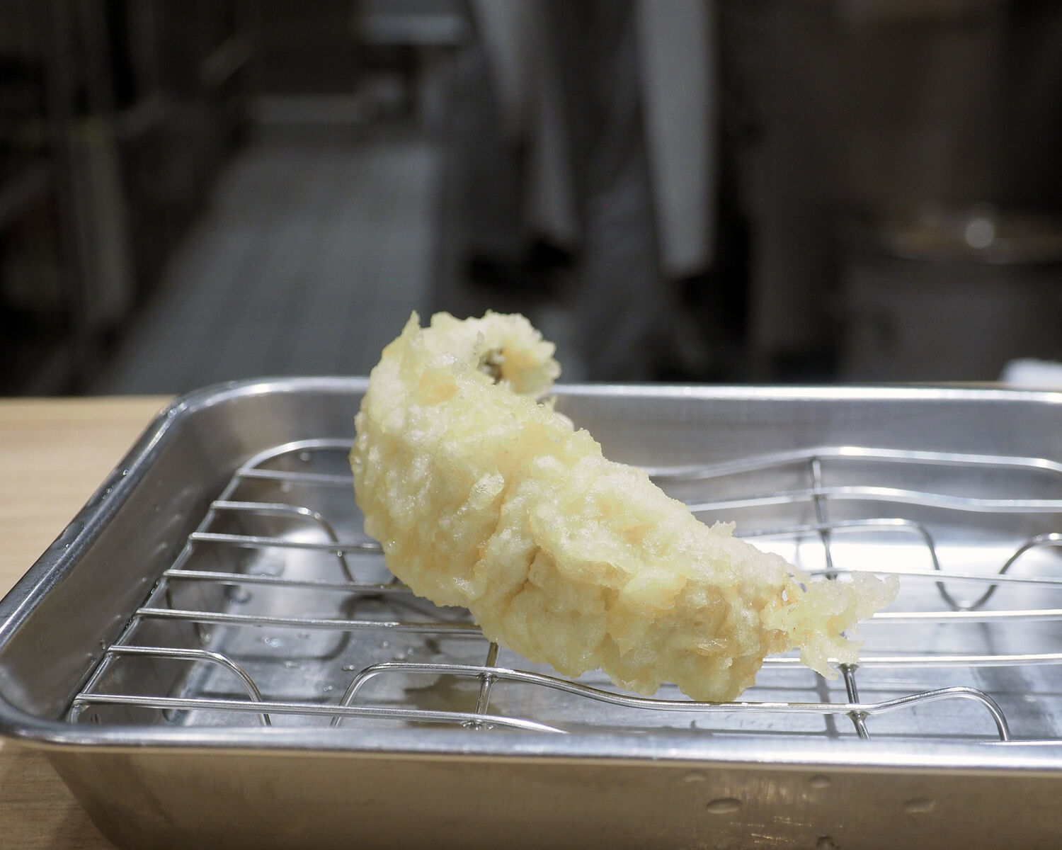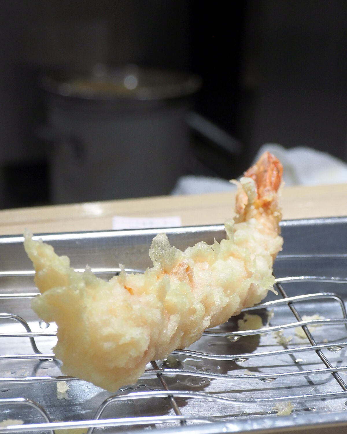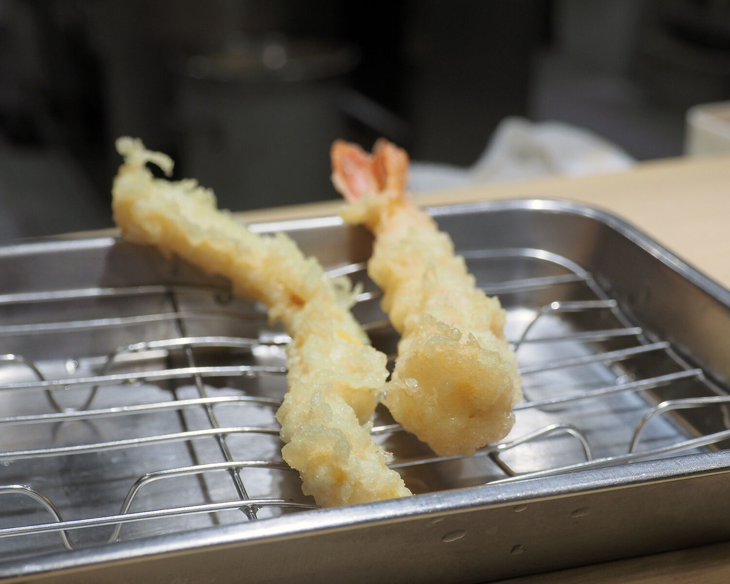 こちらの天ぷらは一皿に盛られて提供されるのではなく、タネひとつ一つの揚げたてを卓上に準備されたステンレスの油切り皿に提供してくださるのであります