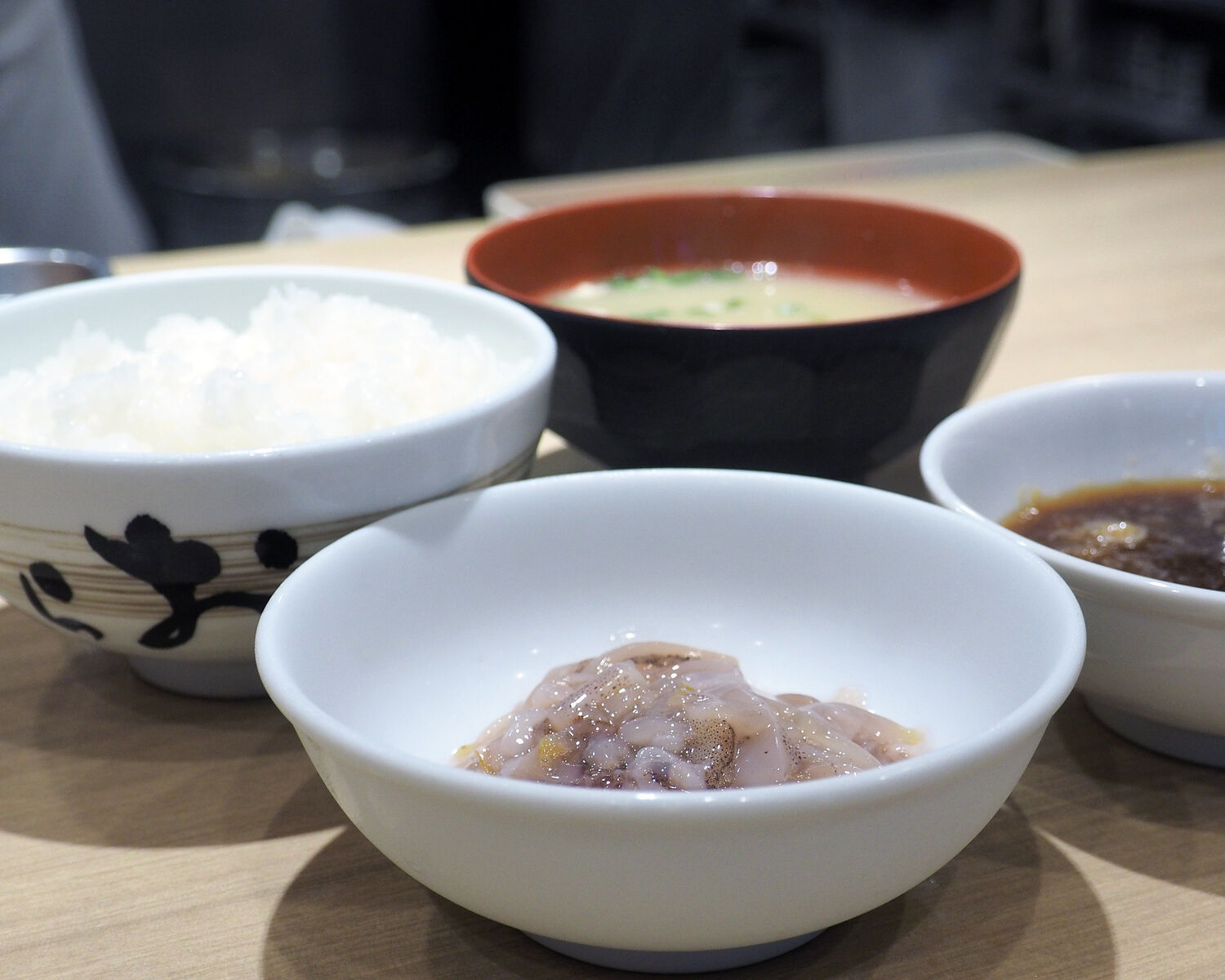 着席してほどなく天つゆが出されたあと、こちらの名物でもある“塩辛”とともにご飯と味噌汁が用意されます