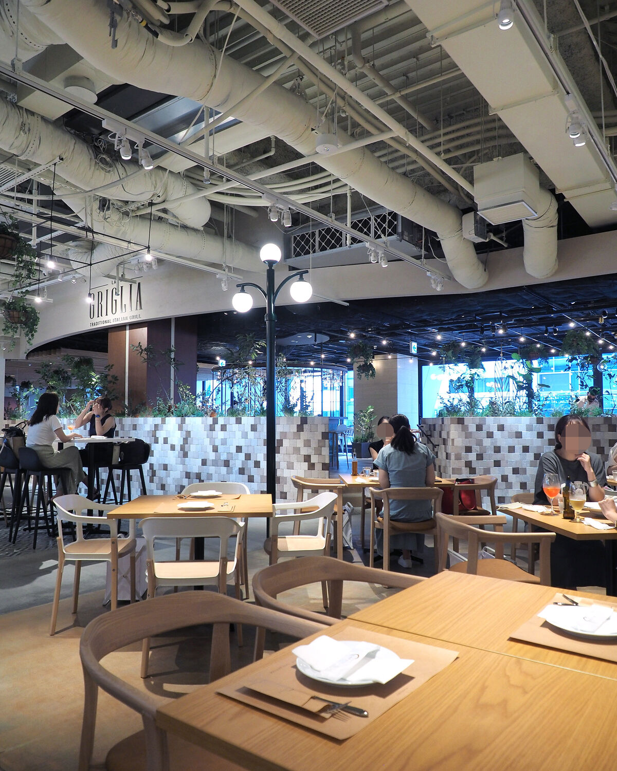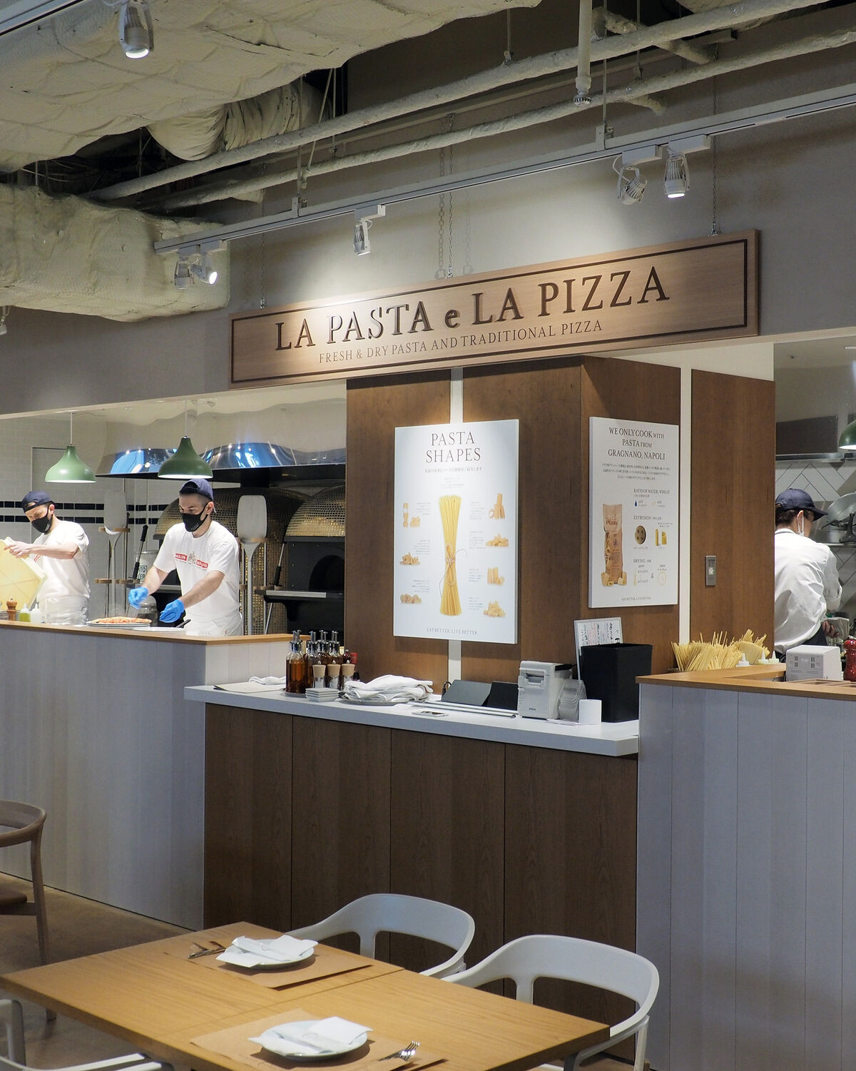 入口左手にはイタリア食材の物販コーナーがあり、右手には“LA PASTA e LA PIZZA”と名付けられたピッツェリアとバールの“LA PIAZZETTA” その奥には肉料理をメインとしたリストランテ“LA GRIGLIA”と利用動機に合わせて使い分けができますね