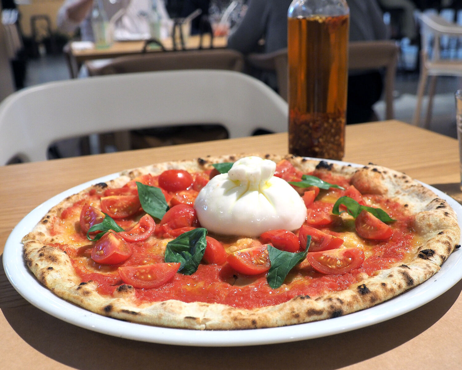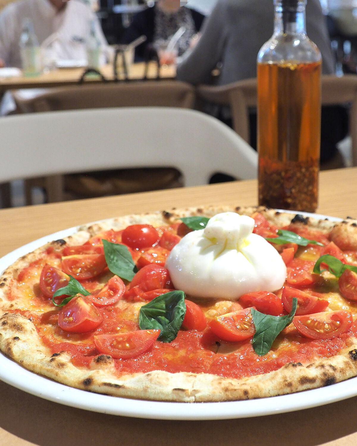 サクッと香ばしく焼かれていながらももっちりとした食感を残す生地がおいしいピッツァには贅沢にもたっぷりなミニトマトが乗せられていますし、中央に乗せられたブッラータにナイフを入れますと、モッツァレラで包まれていたカードと呼ばれるフレッシュチーズが流れ出てきまして…