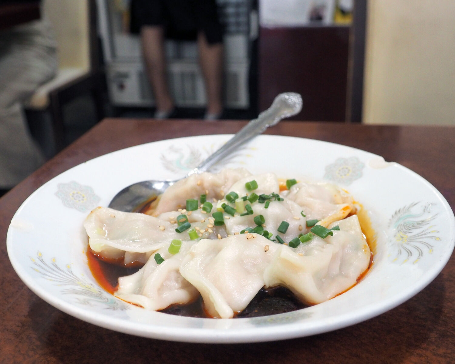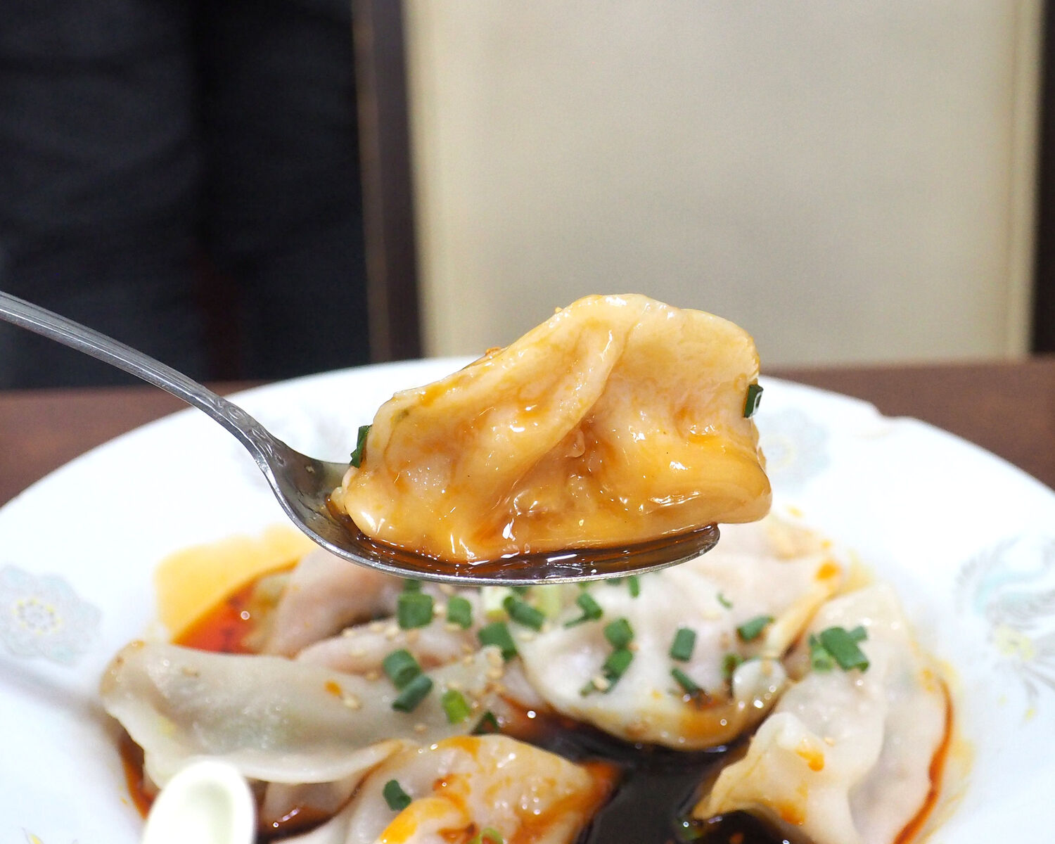 先ずは「李姐餃子」 茹で上げられた水餃子に醤油ベースのタレと辣油がかけられていまして…