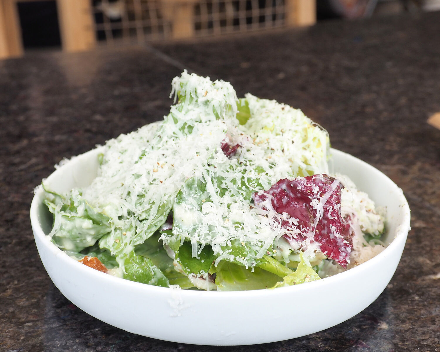 ロメインレタスをベースにしたシーザーサラダには15mmほどにカットされたアンチョビや、カリカリに焼かれたバゲットを使ったクルトンが乗せられていて…