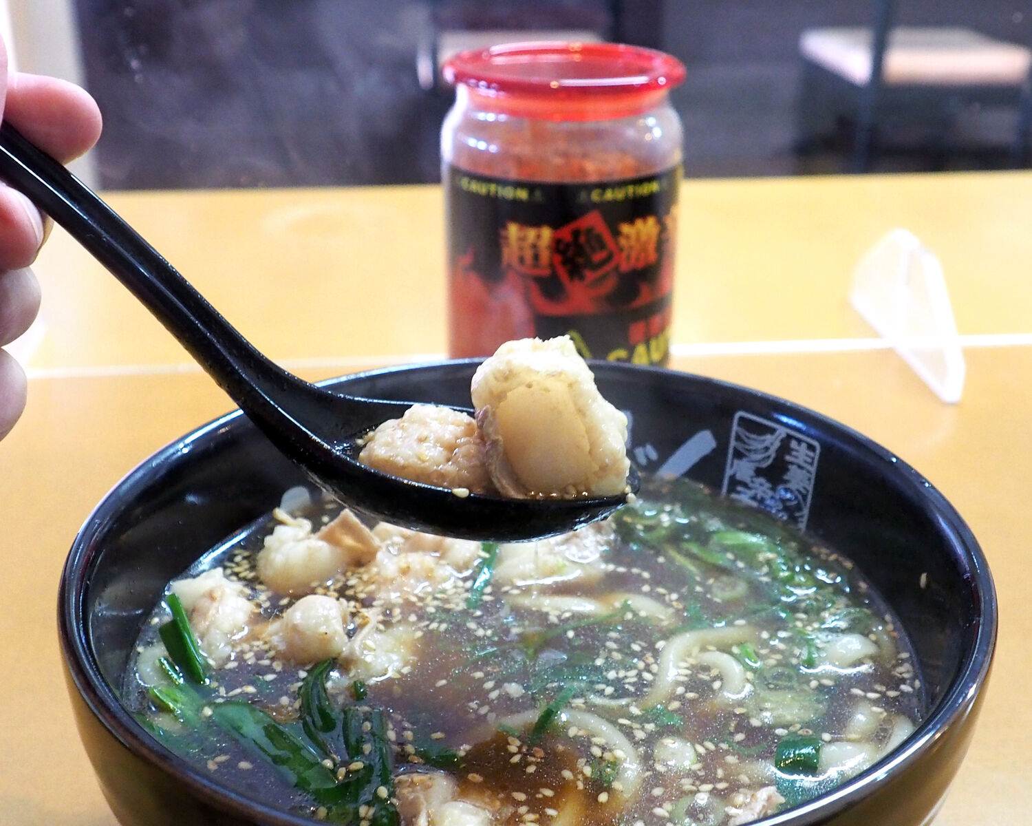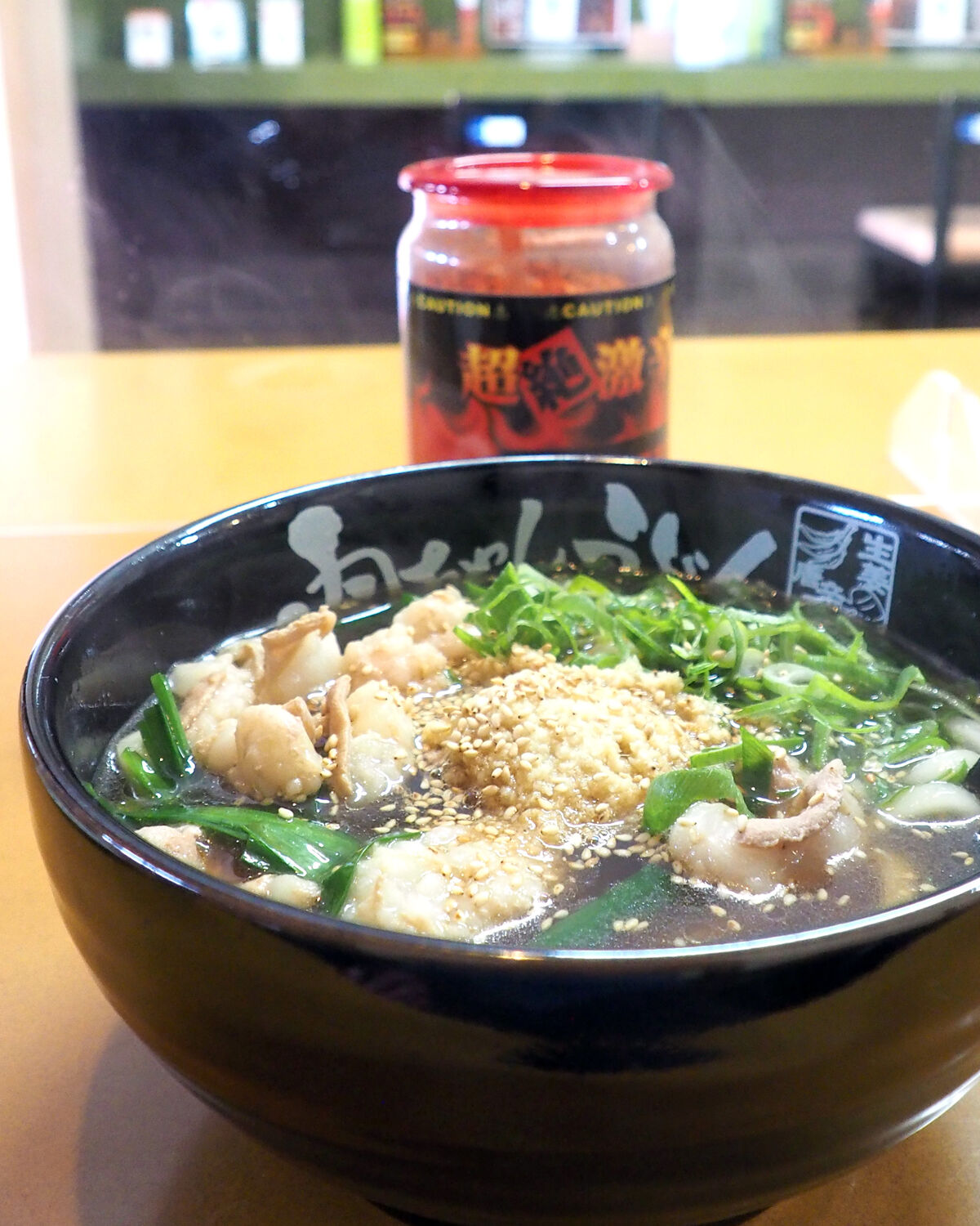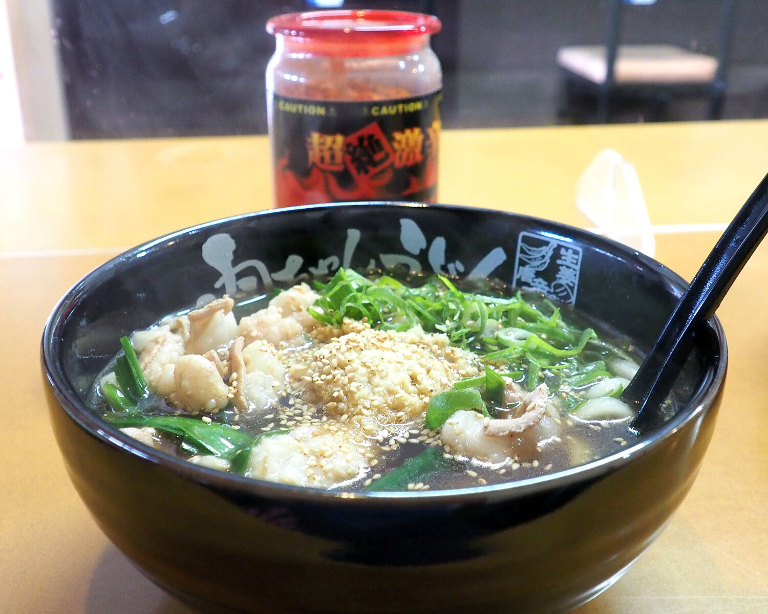 真っ黒なお汁であることから濃いめな味が連想されるのですが、たっぷりと生姜が乗せられていることでさっぱりといただくことができますし、ぷりっぷりのホルモンもおいしく…