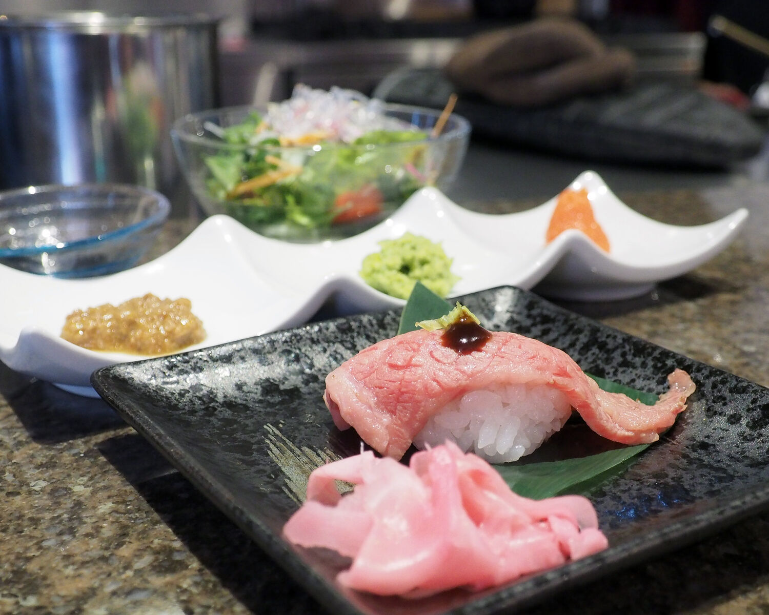 肉寿司はお肉の柔らかさだけでなく、ほど良くかんだ脂身のさっぱりとした味わいと赤身のコクを感じることができるものでありました