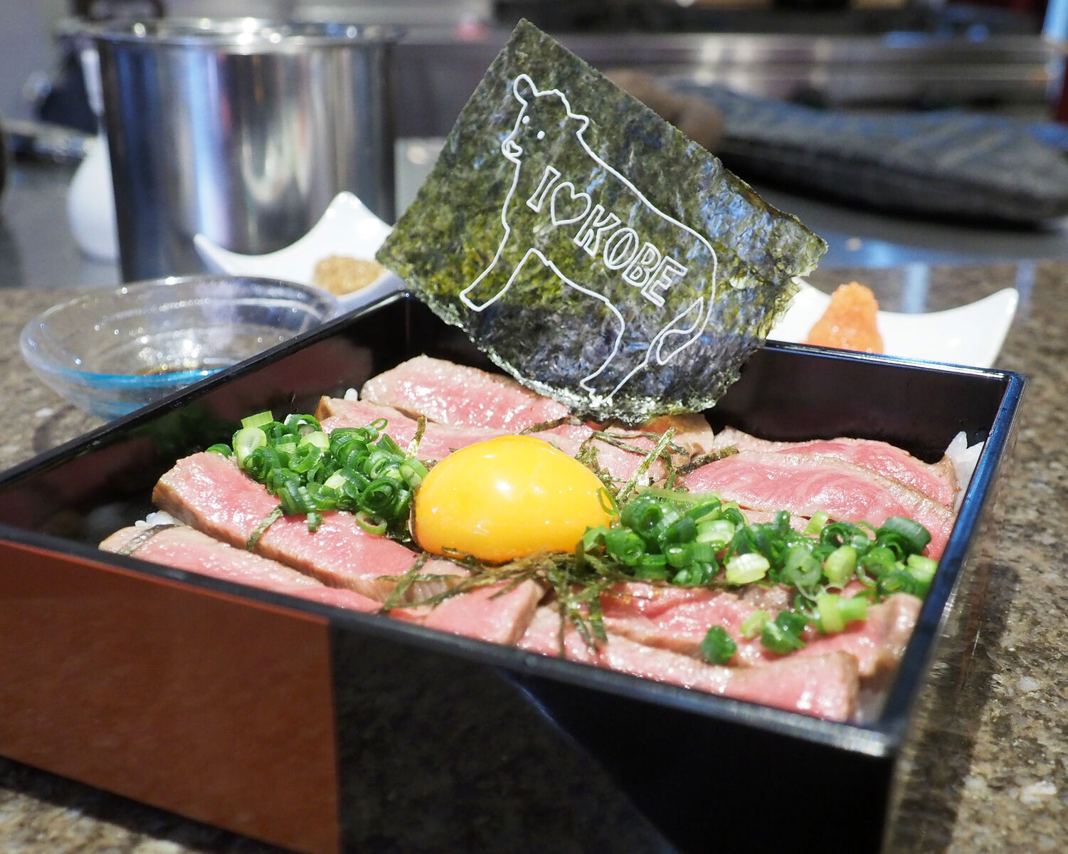 お肉の表面はしっかりと焼き固められていながらもしっとりとしたレアに焼き上げられたステーキがスライスされ、お重に装われたご飯が見えないくらいにびっしりと敷き詰めてありまして…