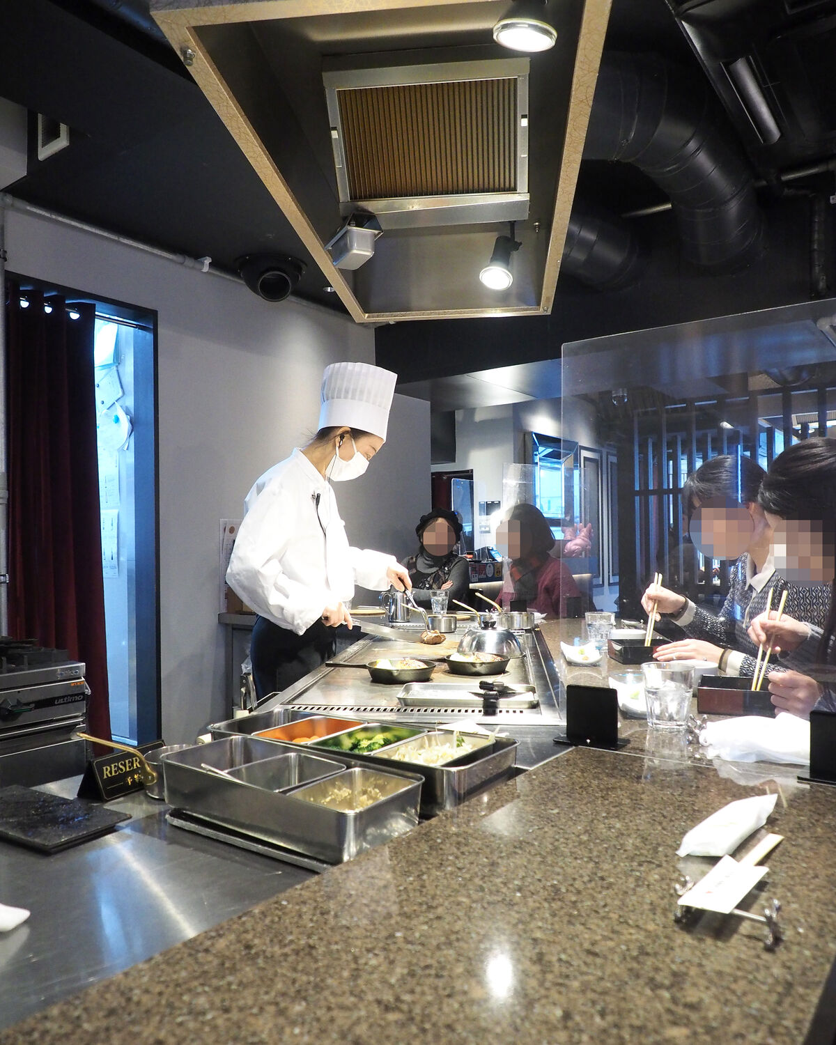 一階には3つのブロックに分かれた鉄板焼きのカウンターがありまして、それぞれにコックさんが目の前で調理していただくことでの臨場感やコミュニケーションなどが楽しめるであろうと期待も高まります