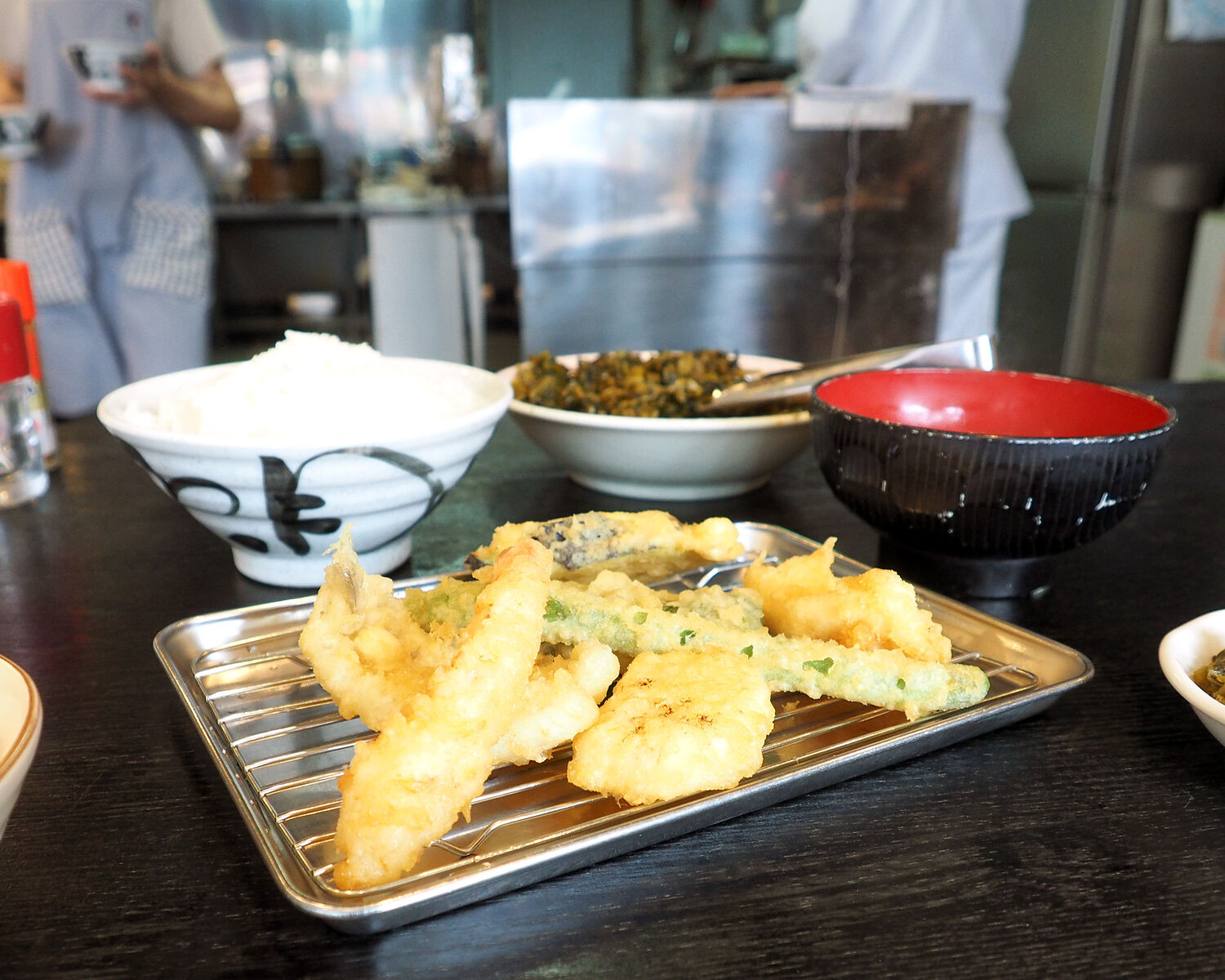 揚げたての天ぷらがいただけることも然ることながら、定食としてご飯をおいしくいただけるようにと、たっぷりな大根おろしが入った濃いめの天つゆが添えられますし、ご飯のお供としていただける高菜漬けも大きめな器に盛られていますので、好きな分だけを小皿に装うことができたりと魅力的でありました