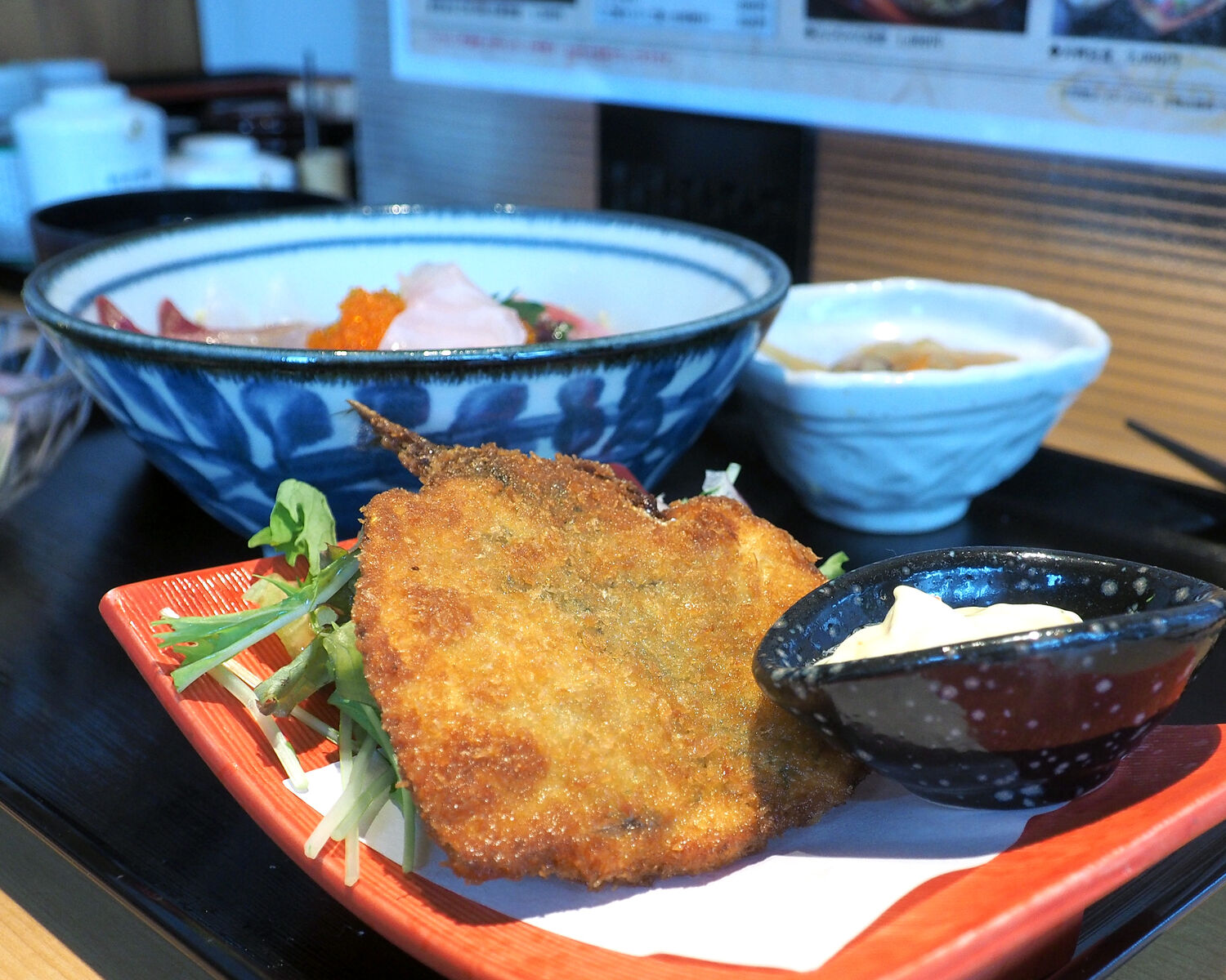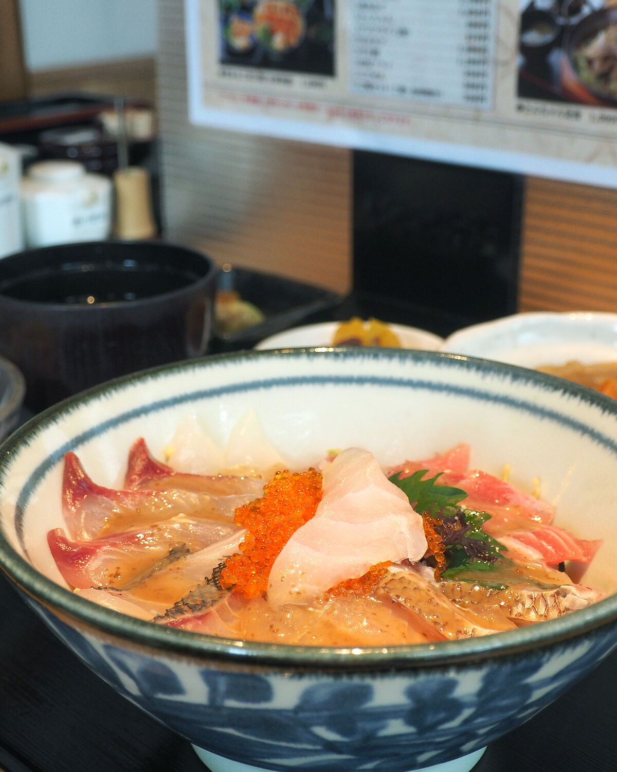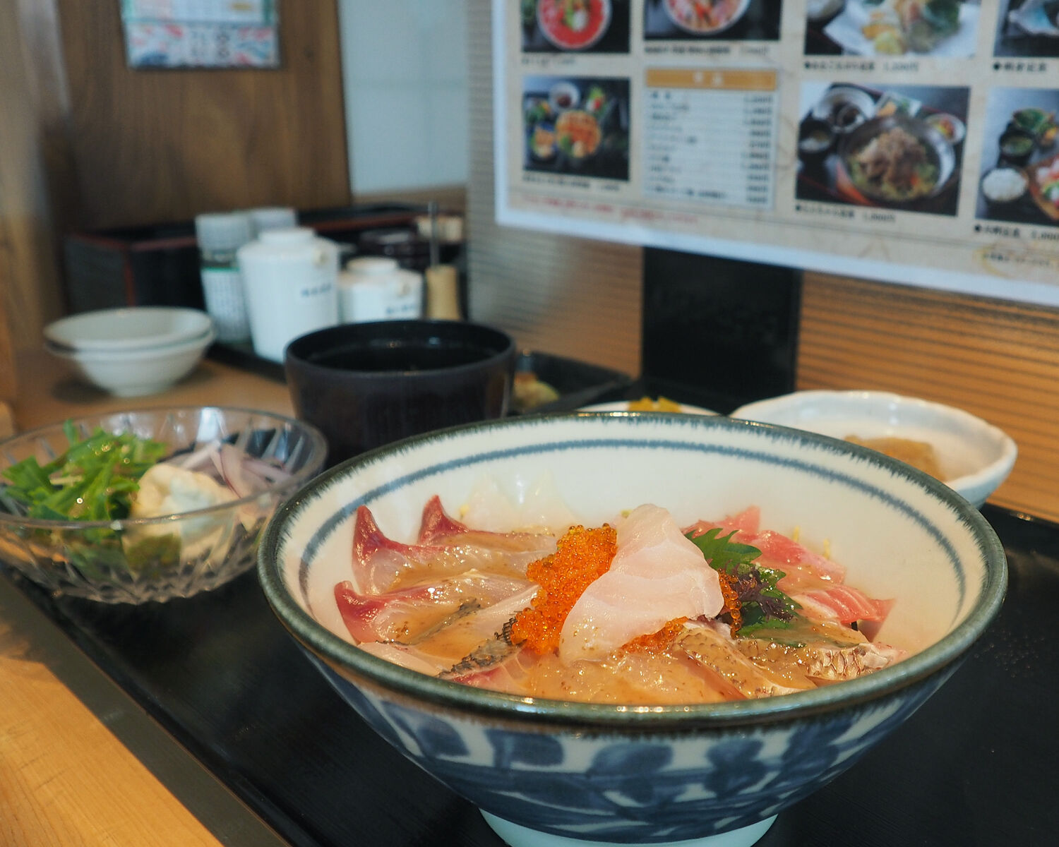 それで「海鮮丼」をいただくことにしたのですが、メニューに載せられた写真の丼から盛り上がるように盛られたビジュアルとは異なっていたことにはがっかりではありますが…