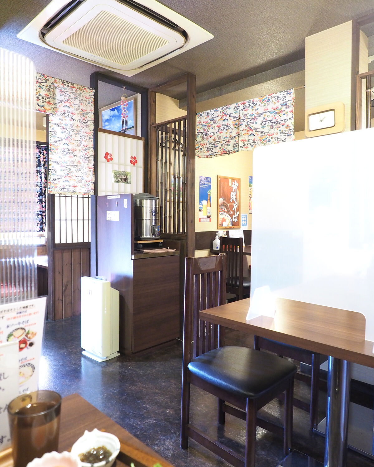 20席ほどの落ち着いた雰囲気の空間には紅型調の暖簾など沖縄らしさを感じるような演出が成されています