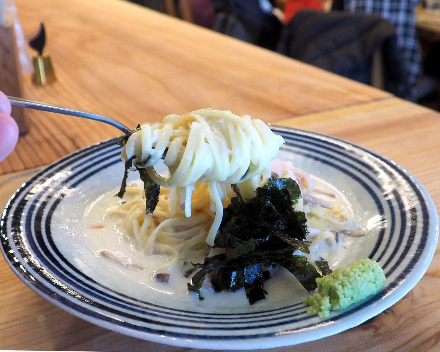 その弾力ある歯ごたえが心地良くいただけますし、わさびの香りや海苔の風味がクリームソースと相性が良いとは新たな発見であります