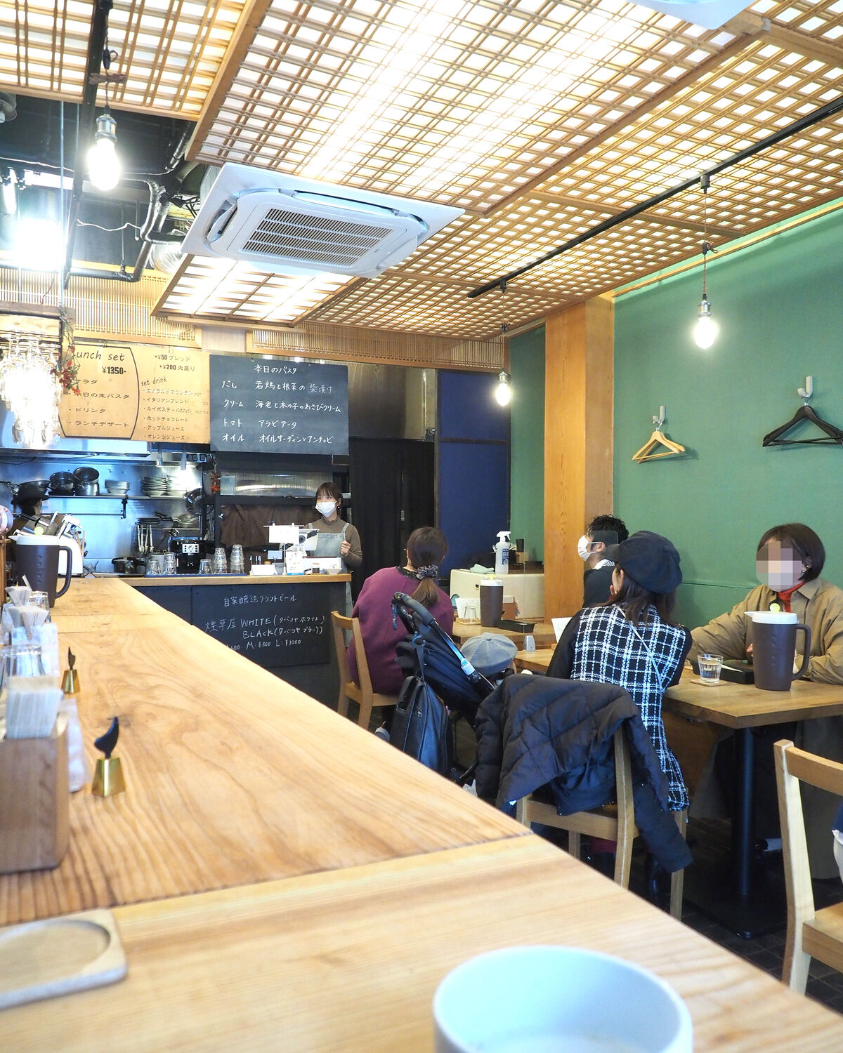 カウンター9席のほか2名席が5卓並ぶ店内は、ターコイズグリーンの壁紙や木調のテーブルや椅子が置かれることでカフェのような明るい雰囲気を感じるものでありました