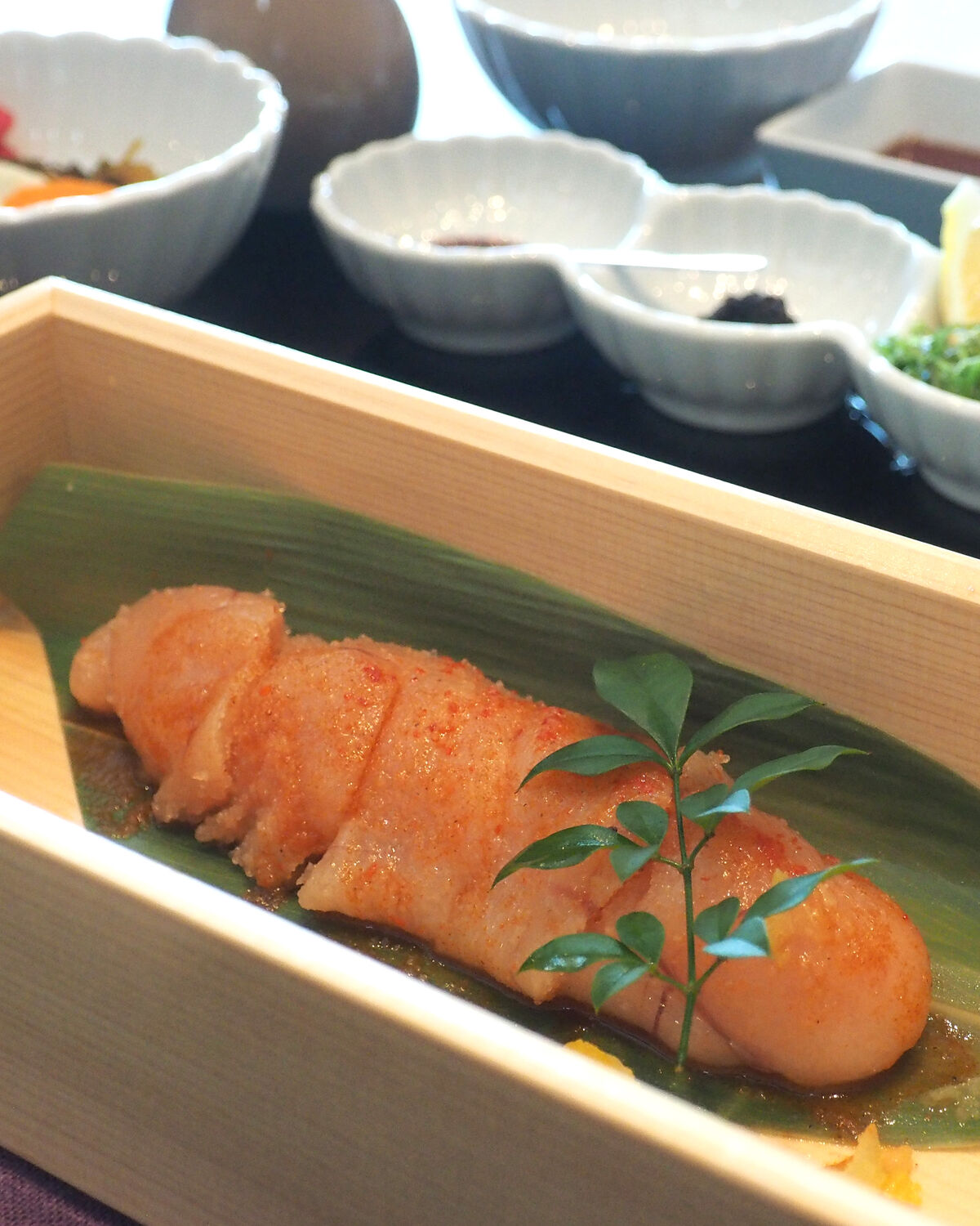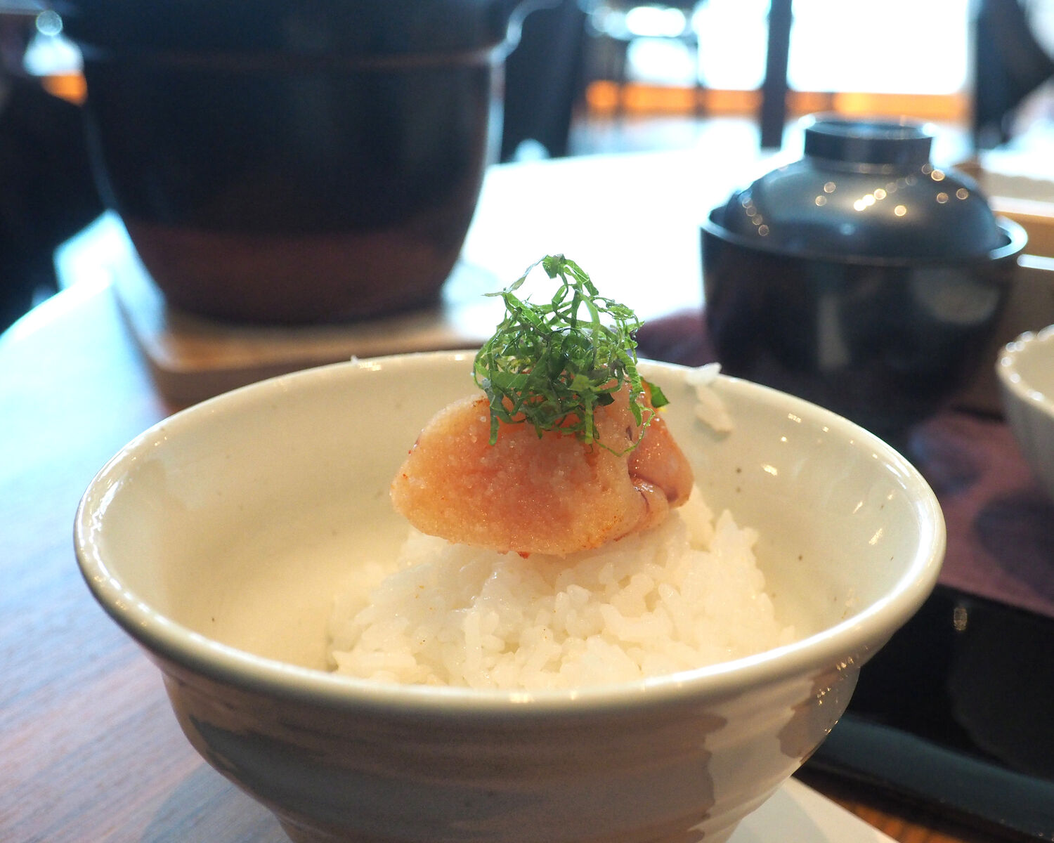 そんな明太子を炊き立ての艶々ご飯と一緒にいただくのですが、添えられた梅はちみつと海苔佃煮、大葉レモンと薬味を使っていろんな味わいを楽しみながら贅沢にひと腹いただける幸せに満足することができました