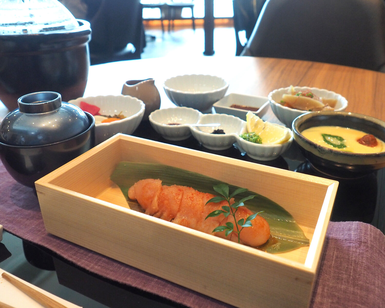 出来立てだと言う明太子に一人前ずつ炊き上げられる土鍋ご飯、それにイカ刺しとモツ煮、茶碗蒸しなどが添えられます
