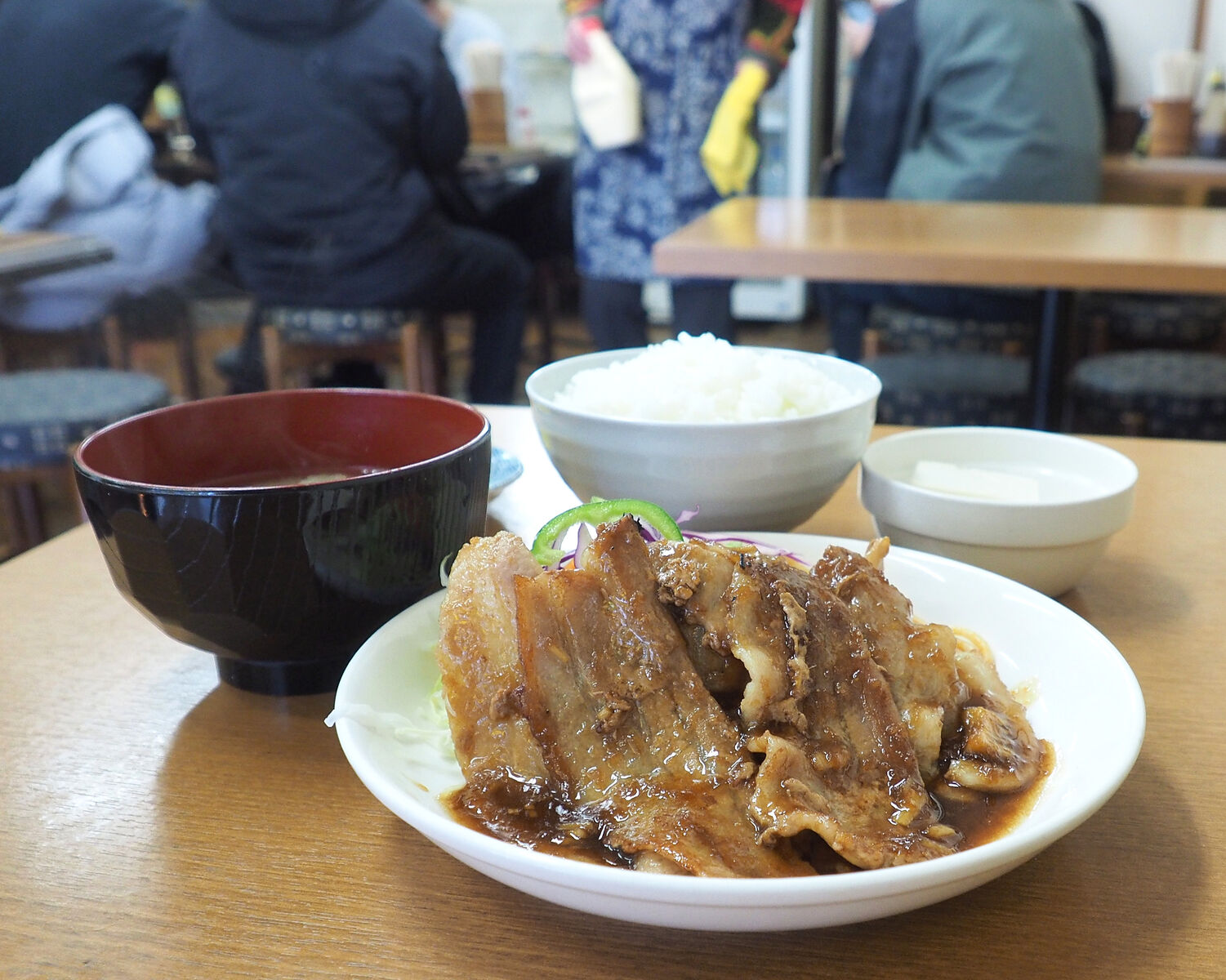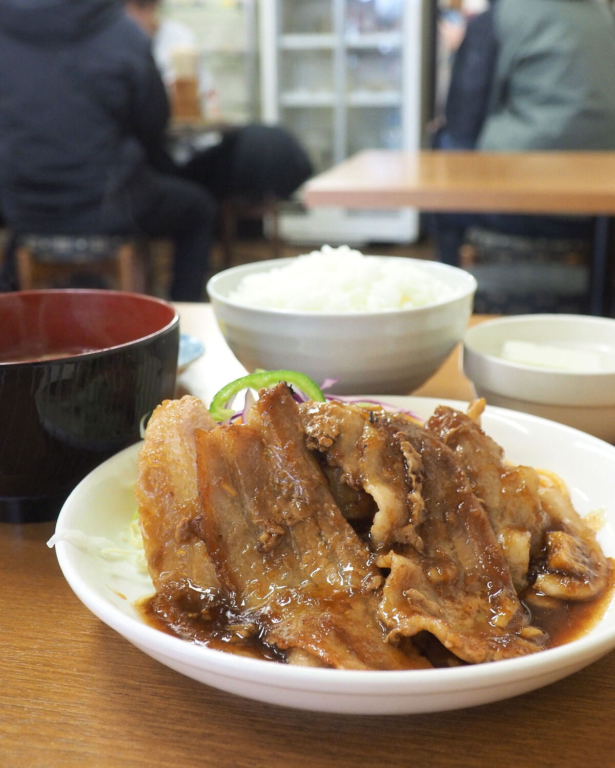 薄切りの三枚肉を使った生姜焼きはご飯が進むようにか濃いめに調味されていますし、そのご飯がちゃんとおいしくて…