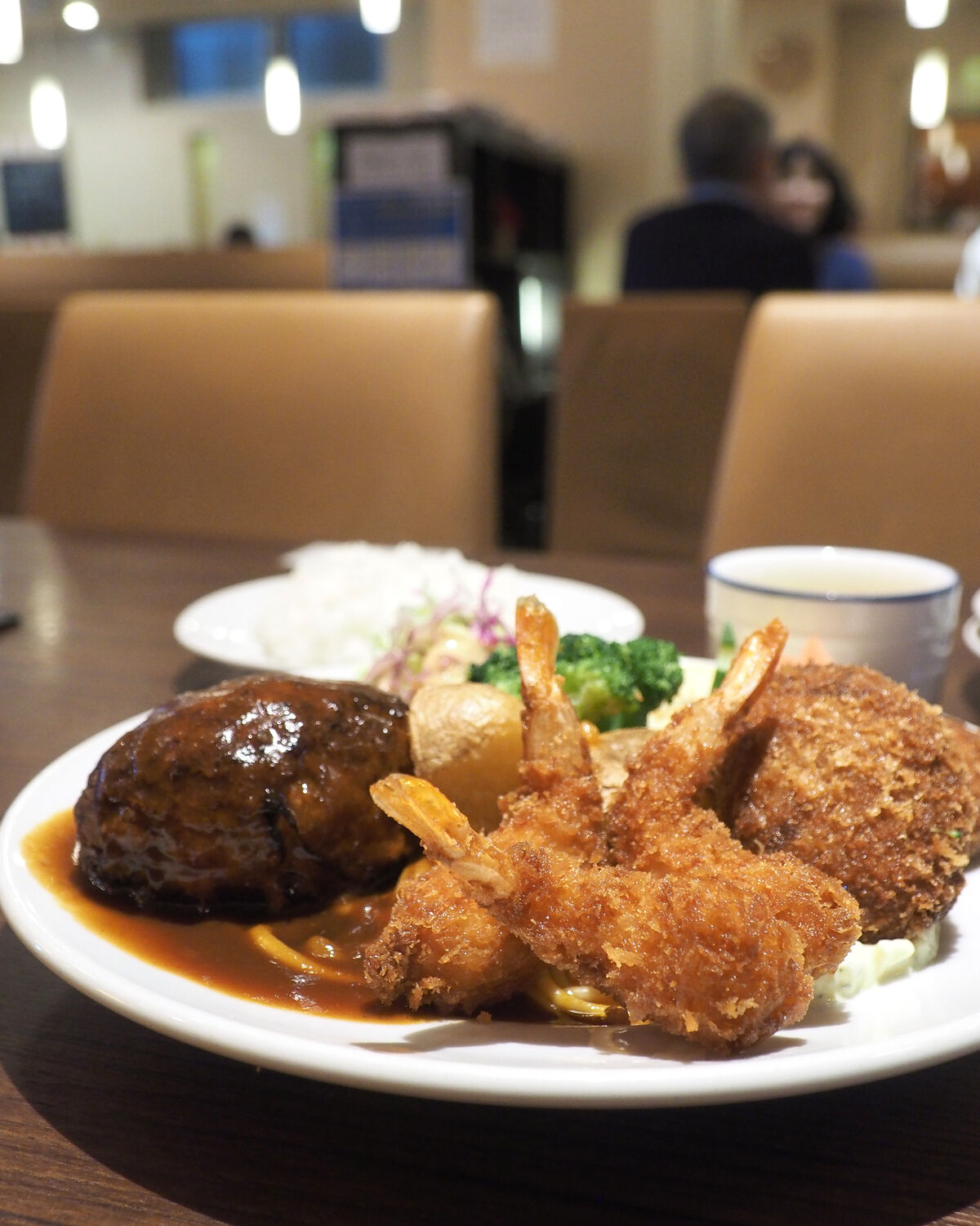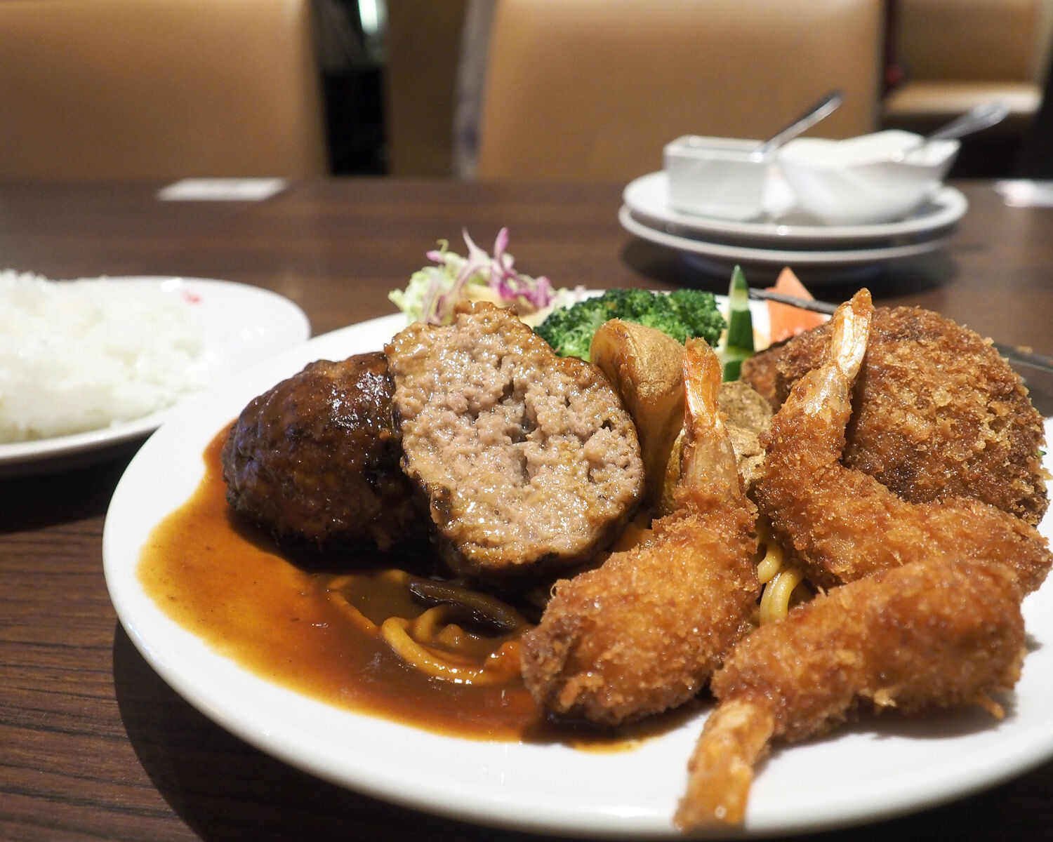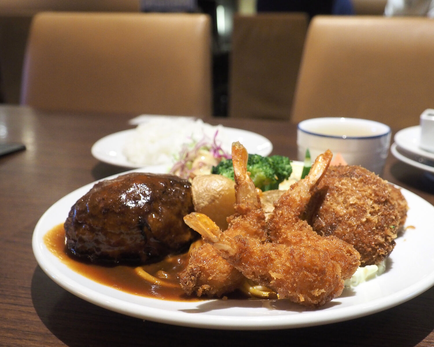 この季節にうれしいカニクリームコロッケを見つけましたので「ズワイ蟹クリームコロッケと小エビフライのMIX」をいただくこととし、オムライスに並ぶ人気メニューであるハンバーグのトッピングをお願いします