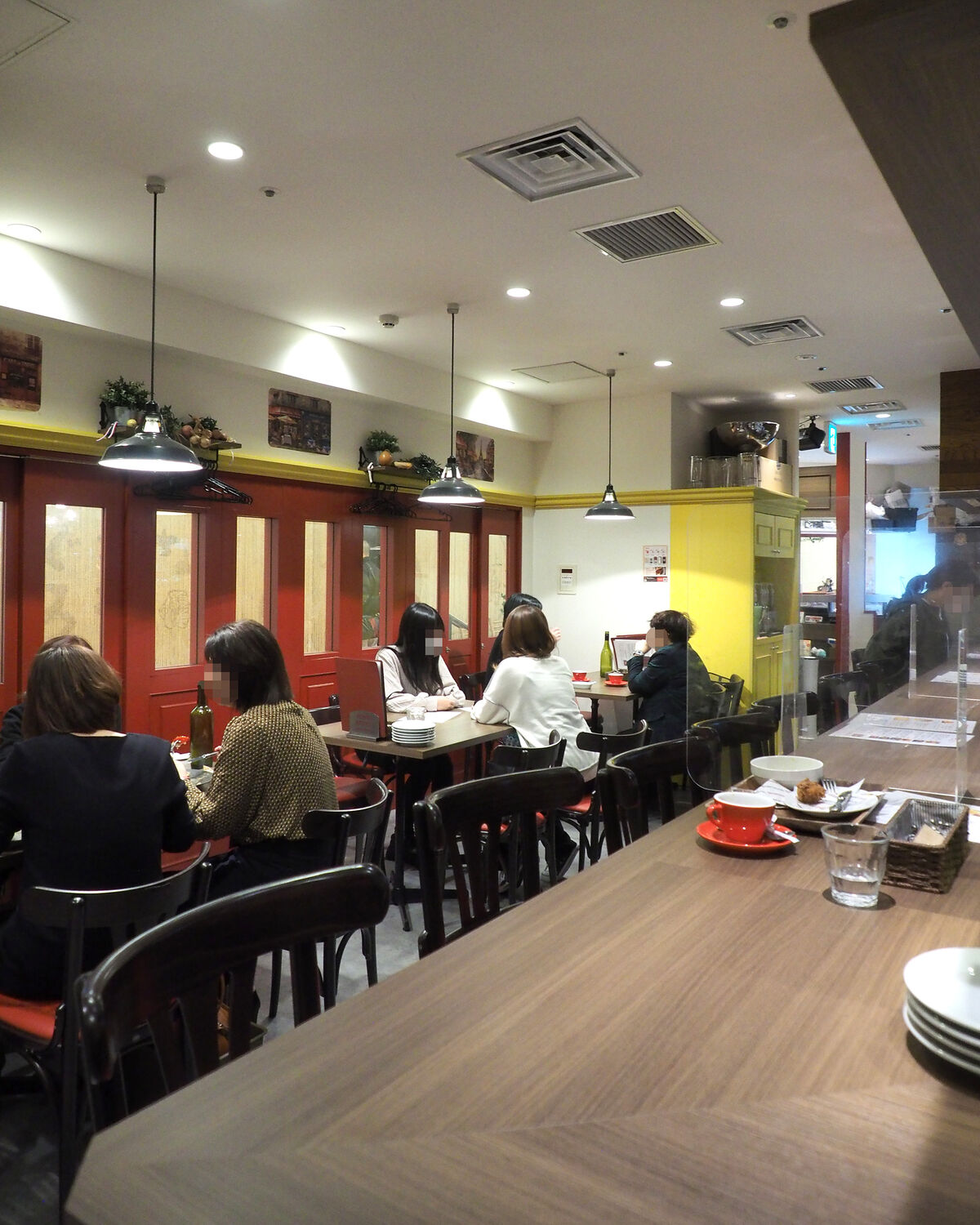 赤をアクセントにした店内には2名掛けテーブルソファー席、カウンター席と50席弱がゆったりと並べられていまして…