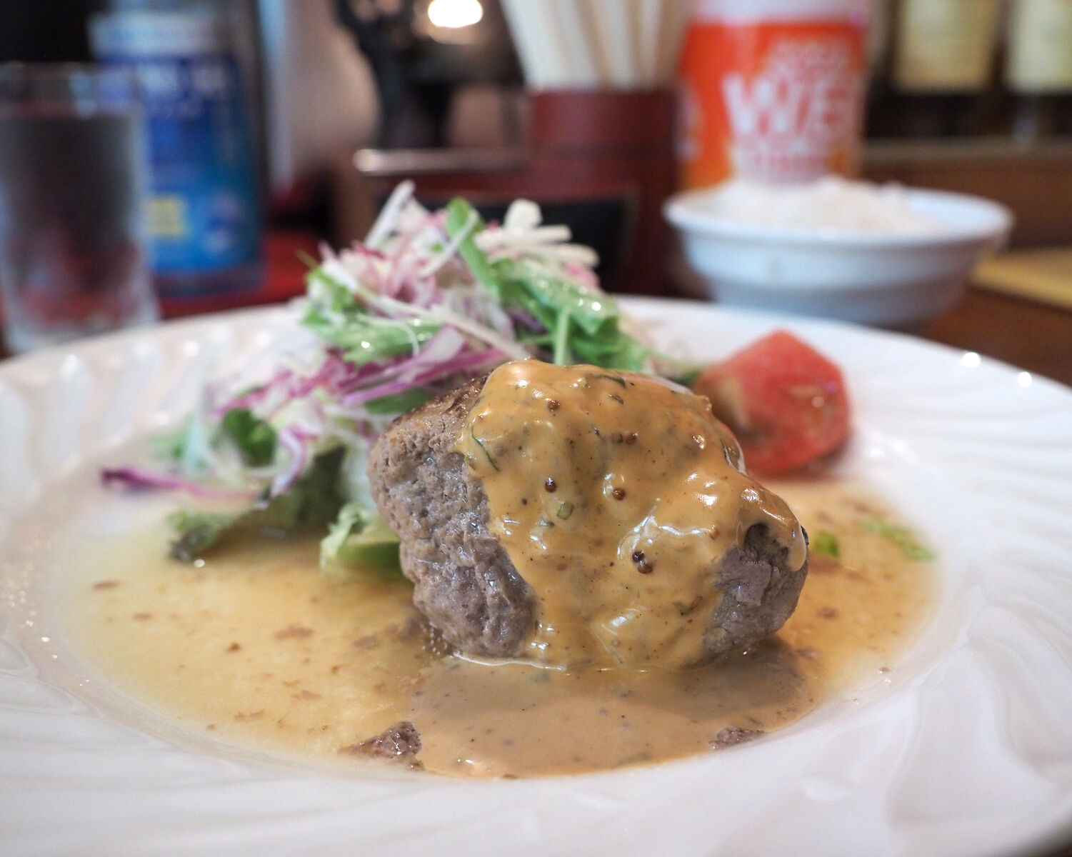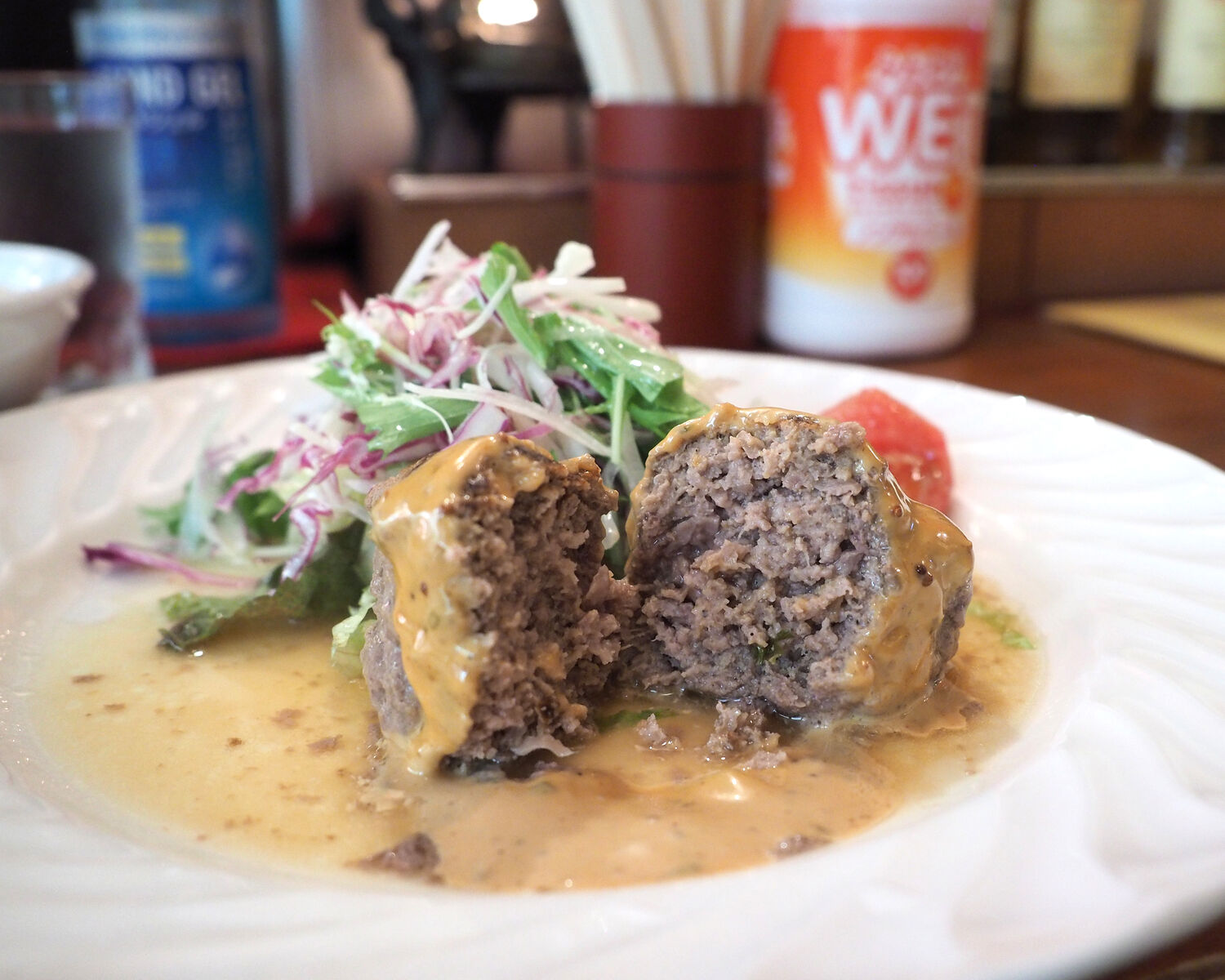 一辺が50mmほどあるブロック状に焼き上げられたハンバーグはミートローフのような歯ざわりと肉の旨みと香辛料の香りを楽しめるものでありました