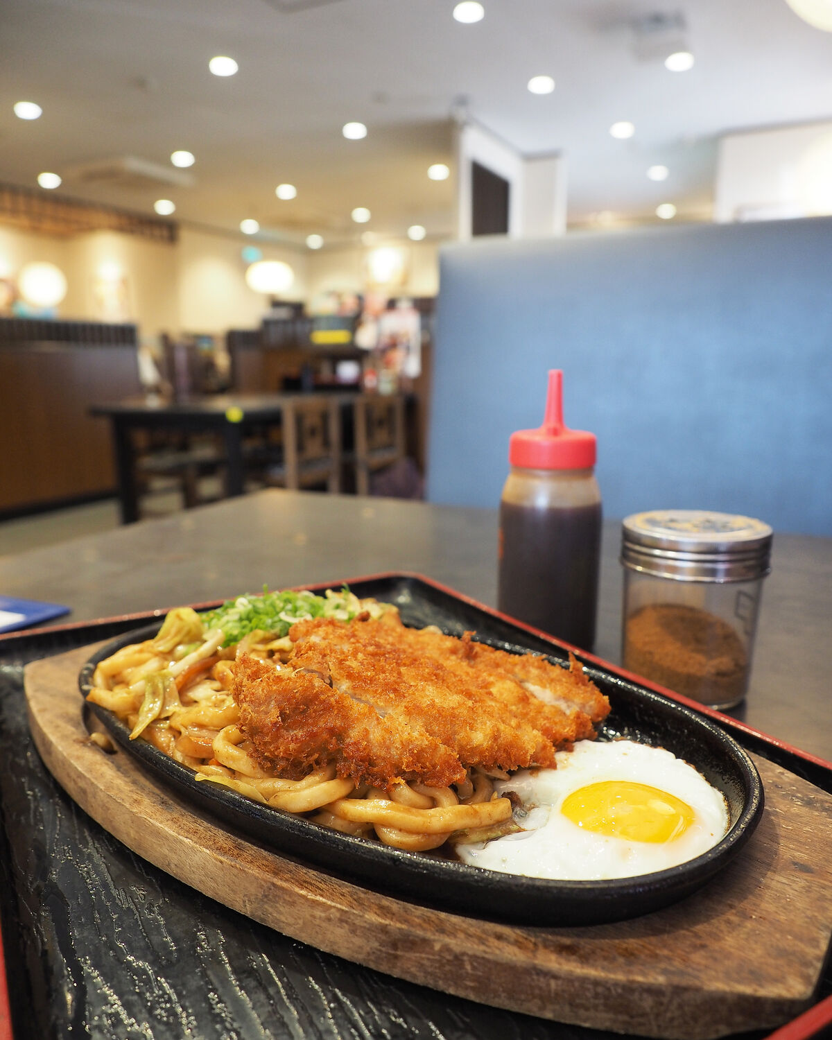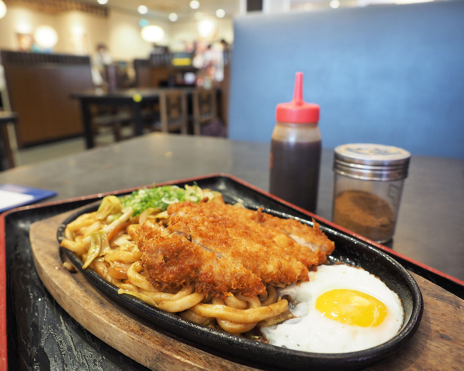 それに、麺料理に揚げ物を添える八幡の文化が合わせられた一品に一目惚れしまして「かつ乗せ焼きうどん」をいただくことにいたします
