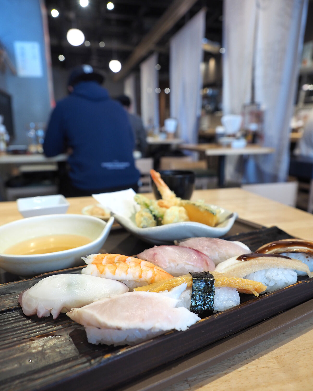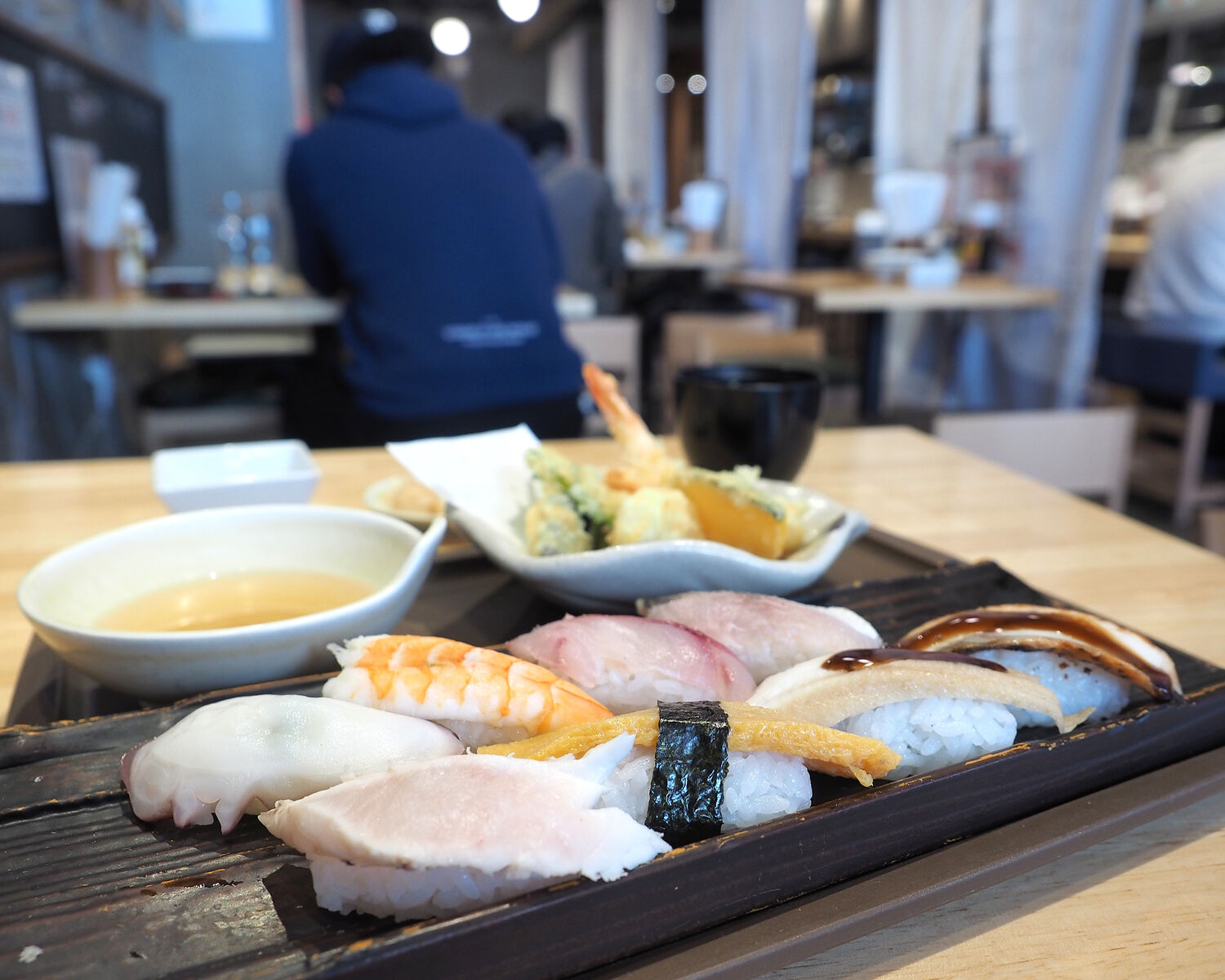 メニューからお寿司推しであることが伝わりますし、壁面には“高級鮨をお手ごろに!”と始まり、魚は毎日長浜市場で買い付けされていることや、黒酢を使ったシャリへのこだわりなどが書かれることから、期待を込めて「寿司天(上)」をお願いすることにいたします