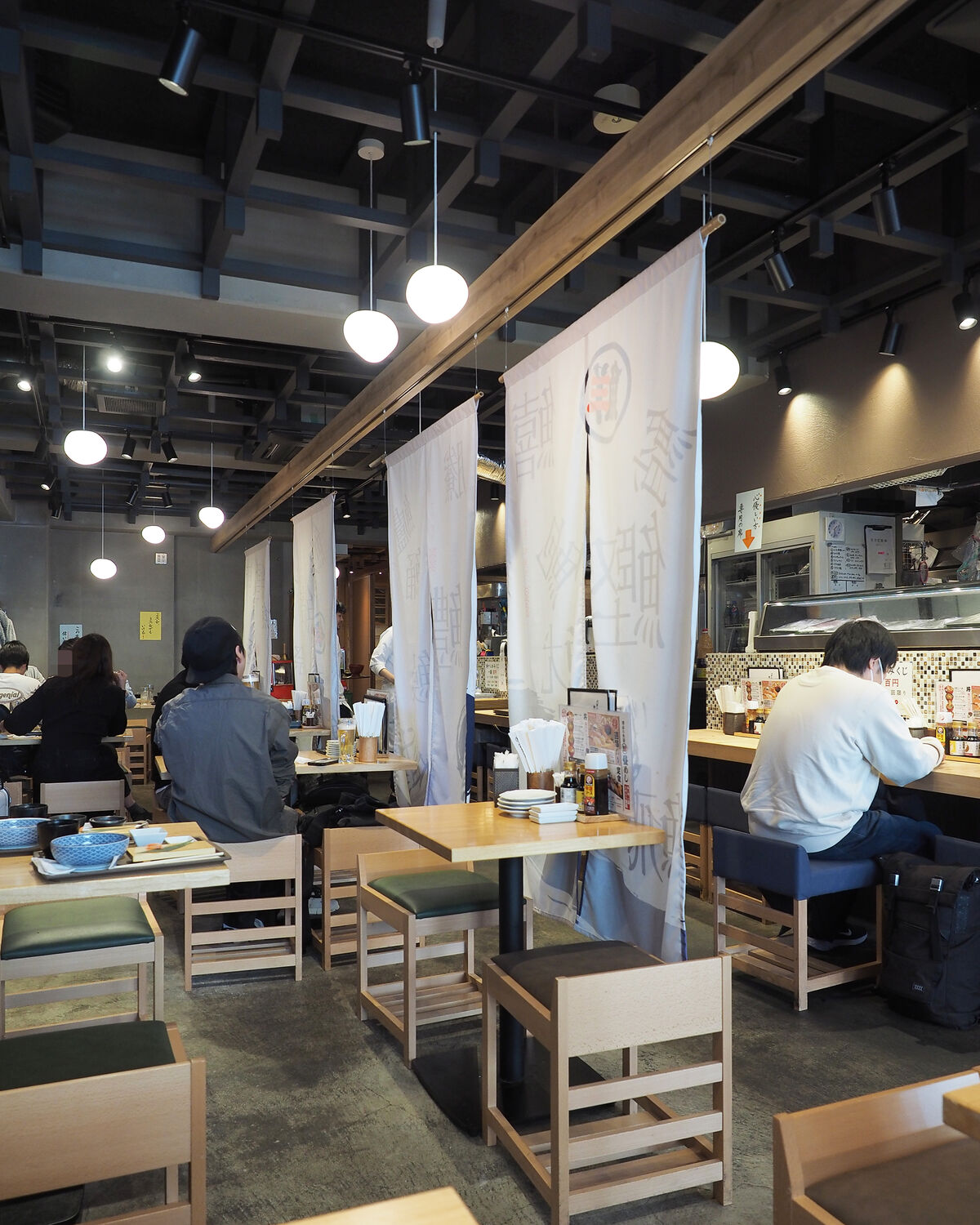 白い暖簾を潜った店内には15席ほどが並ぶカウンターと4名掛けや2名掛けのテーブルが並ぶ30席ほどのホール席、奥には小上がりになった個室もいくつかあるようで…