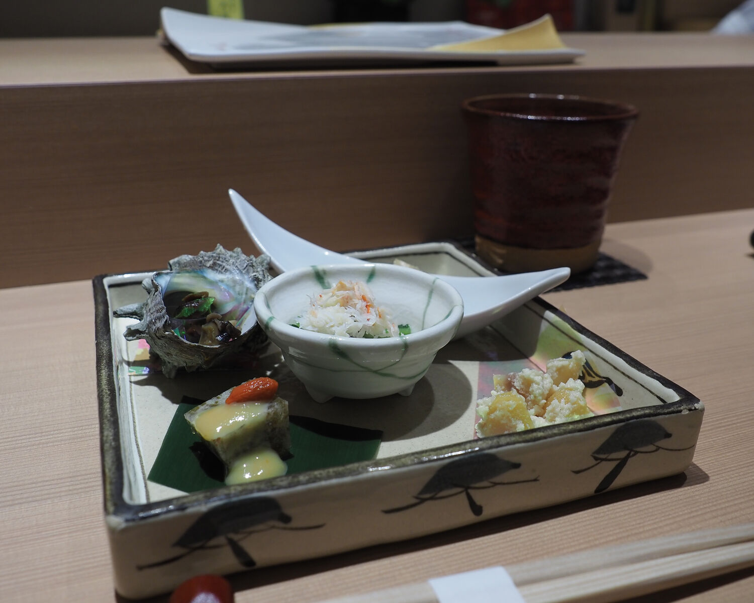 最初に提供された前菜は“サザエの旨煮” “鰆の南蛮” “ズワイガニのほぐし身がトッピングされた青菜のおひたし” “もずくの寄せ” “栗の白和え”の5点盛りであります