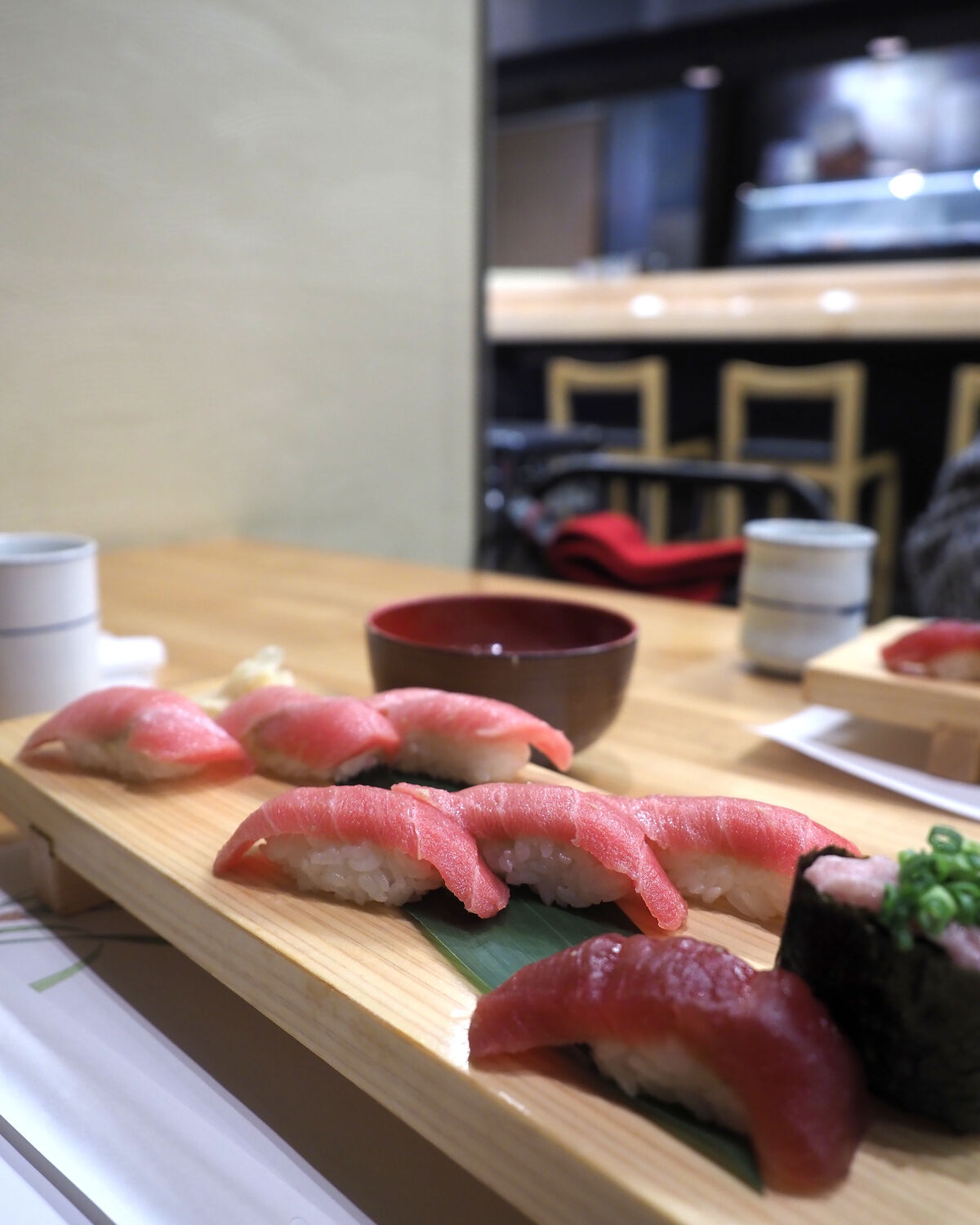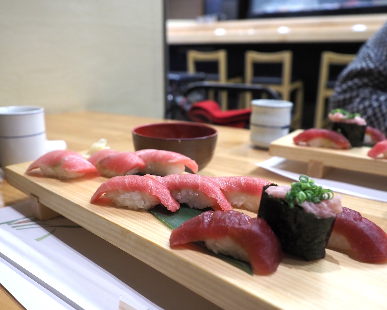 天ぷらとお寿司をいただける「炙り5種にぎり +天ぷら」「厳選5種にぎり +天ぷら」にも惹かれていたのですが、おいしそうなまぐろの魅力に勝るものはなく「鮪づくし握り」をお願いしたします