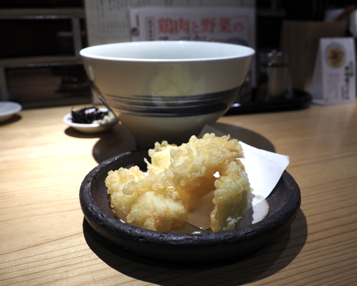赤字で“名物”と書かれる「うどんちゃんぽん」や「おっきなごぼう天うどん」がおすすめであるようでしたがイカ天うどん」に丸天を添えていただくことにいたします
