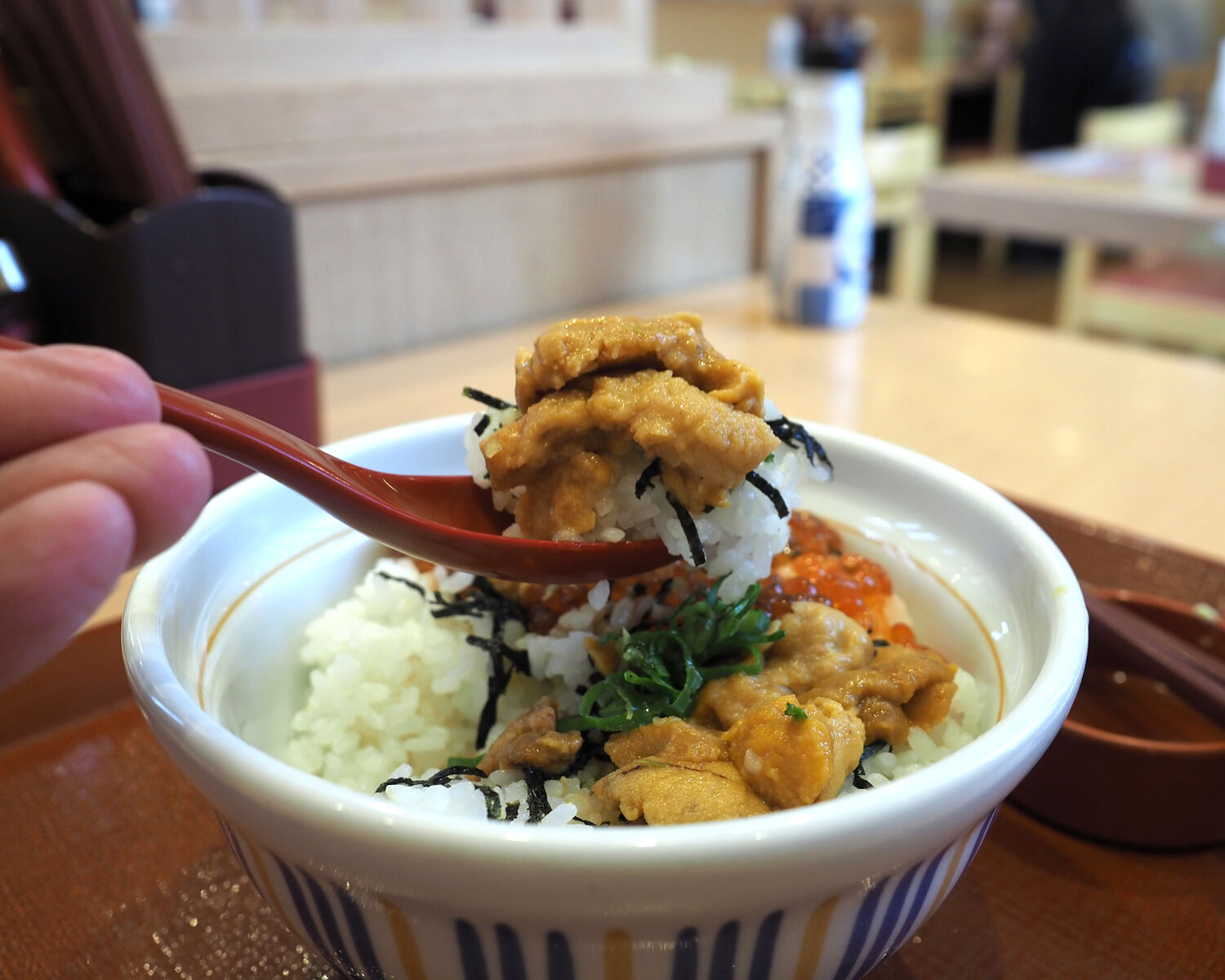 看板料理である「親子丼」が450円で提供されていることを考えるとかなり高単価商品となりますが、“インバウン丼”とも諷刺される豊洲の海鮮丼とは比べものにならないほどお手頃にいただけることに魅力を感じて、「天然うにいくら増し増し丼」をいただきます