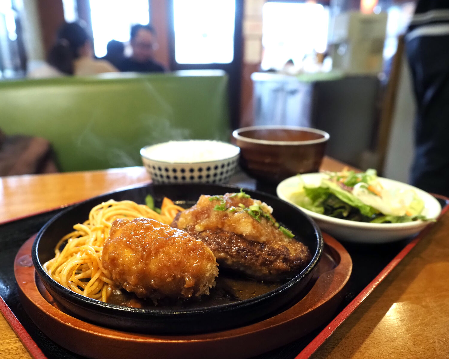 人気No.1とある、ハンバーグとチキンカツ、魚フライ、エビフライの盛り合わせである「衣笠定食」にも惹かれましたが、おすすめとあった「クリームコロッケ&おろしハンバーグ」をいただくことにいたします