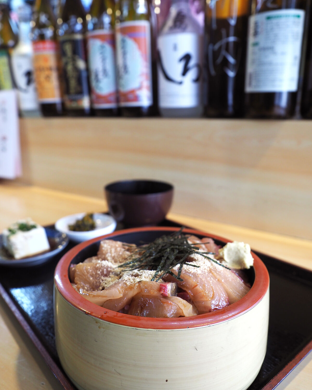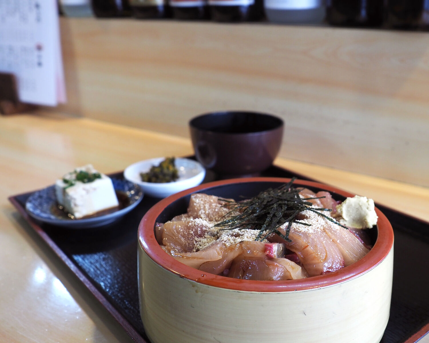 12:00くらいには売り切れになってしまうことも多いと言う人気店でいただいた「づけ丼」は、漬けダレの甘みと引き締まった身の歯ごたえがおいしい“カンパチ”が二重三重にもご飯の上に載せられたものでありました