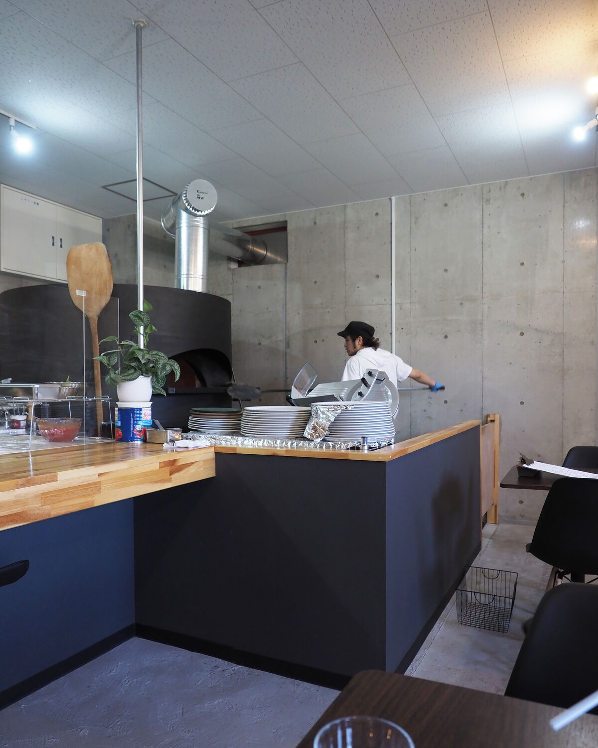 そして、オープンになった厨房と向かい合う3席のカウンターと客数に応じて自在に移動することができる2名掛けのテーブルが11卓が並ぶ店内はコンクリートの打ちっ放しとなっていまして、その雰囲気に合わせるように余計な装飾を施していない薪釜が置かれます