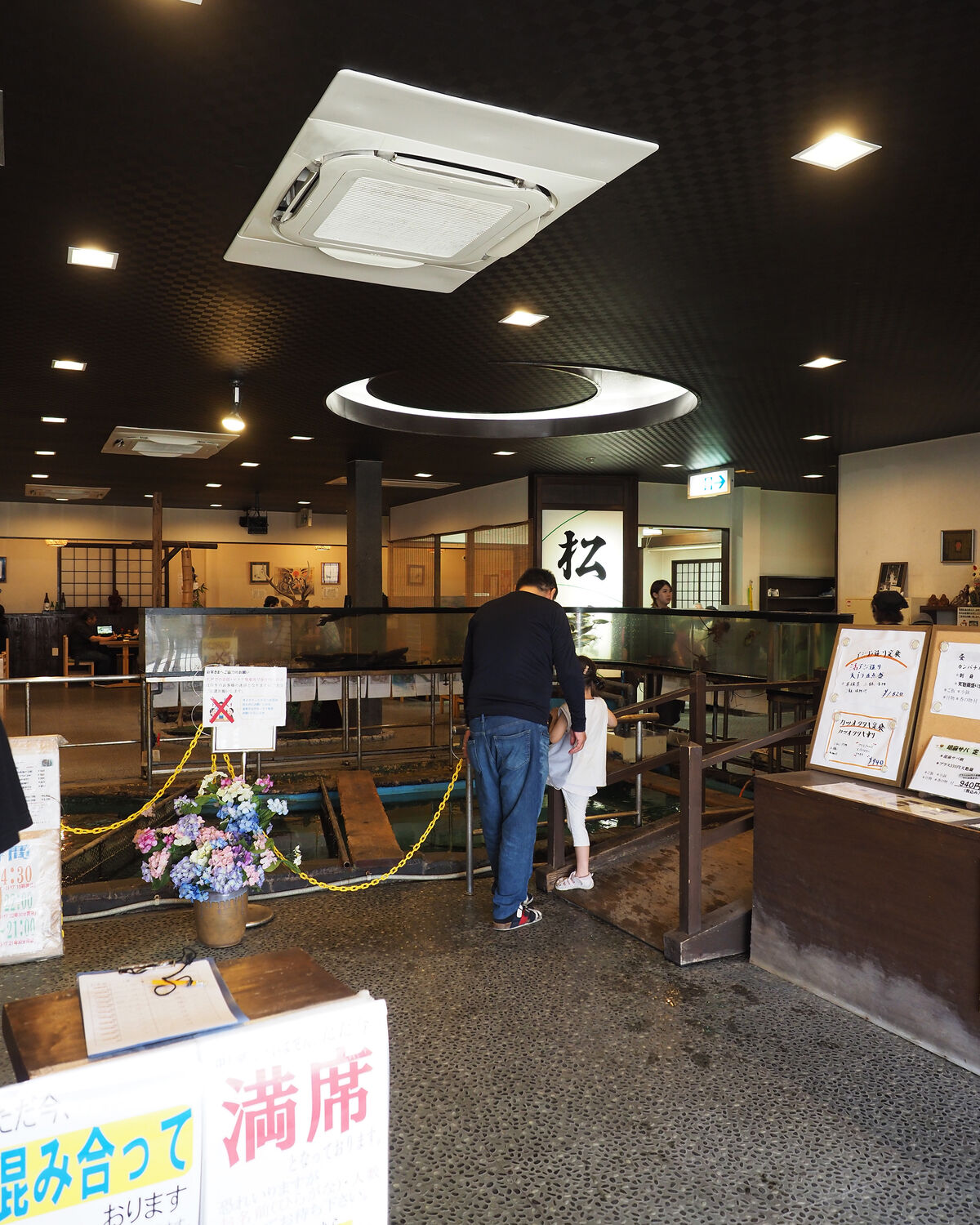 ここならばおいしいお魚料理がいただけるに違いないとお邪魔してみますと、生簀の向こうにあるテーブル席や大広間は予約の席を含め満席になっているとのことでありました