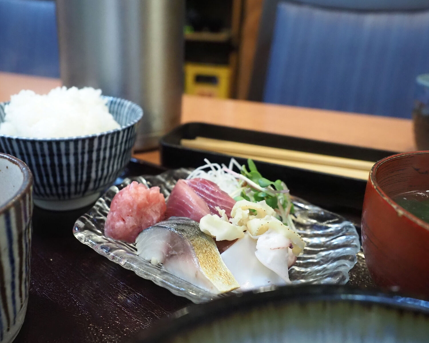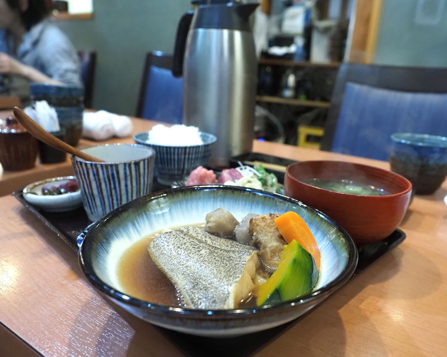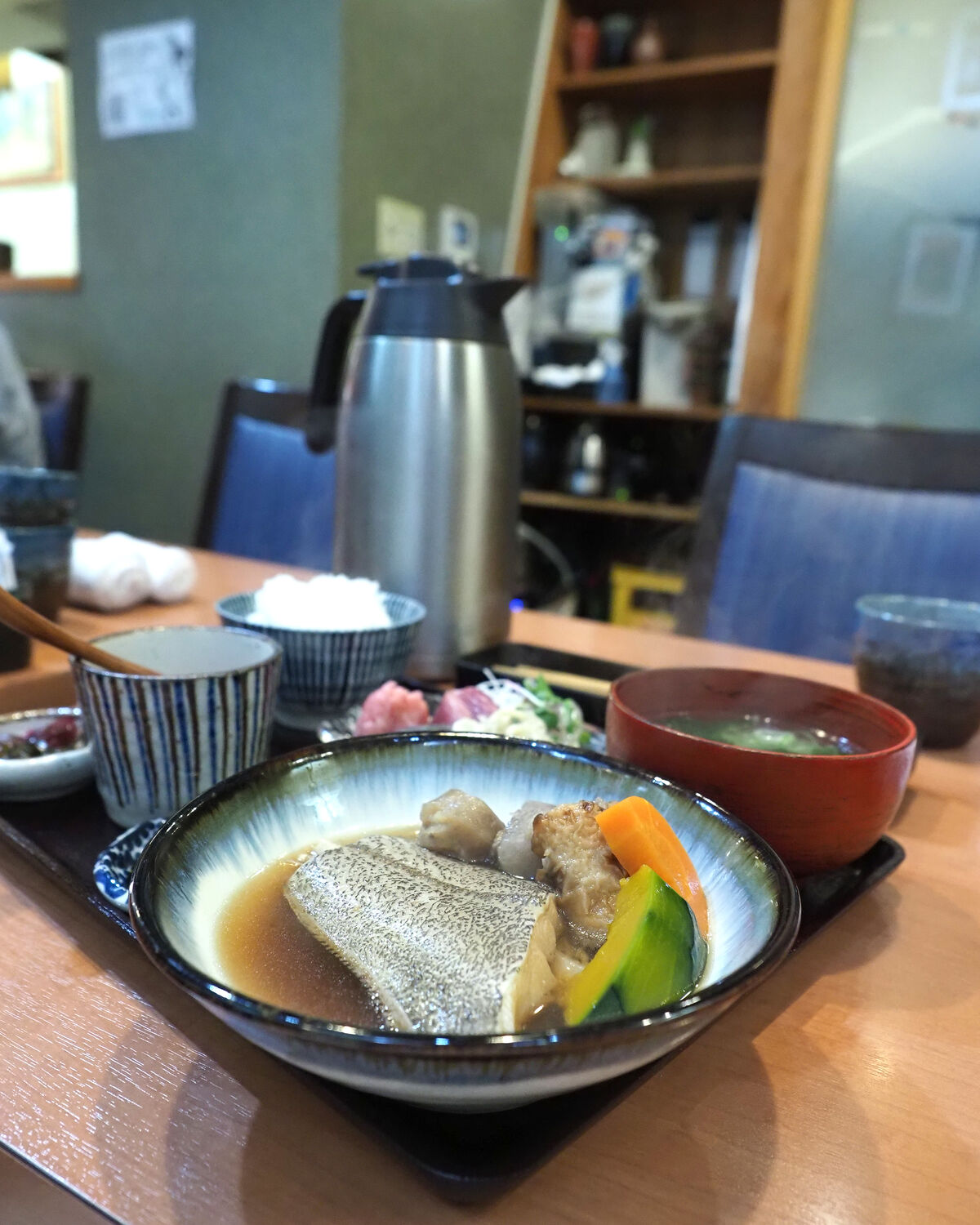 かれいは思っていたよりも小ぶりでありましたが、里芋や南瓜、にんじんなど彩よく野菜の煮物が添えられていますし、鰹や鯖、鮪のすき身などお刺身が付いていることに満足でありますし…
