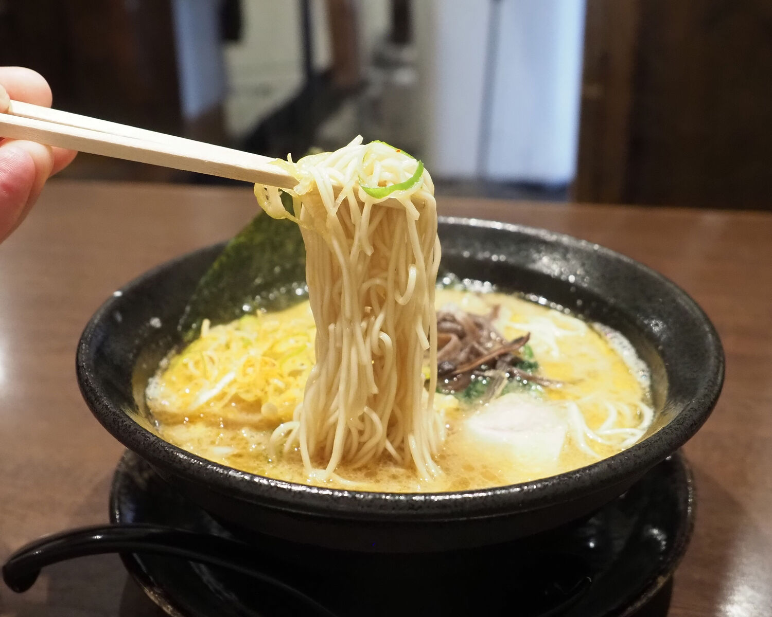 豚骨醤油の麺は博多らしい“細麺”と、まぜそばに使われるであろう“ちぢれ麺”のいずれかを選ぶことができますので、豚骨醤油から辛ネギらーめんを選び細麺でお願いいたします