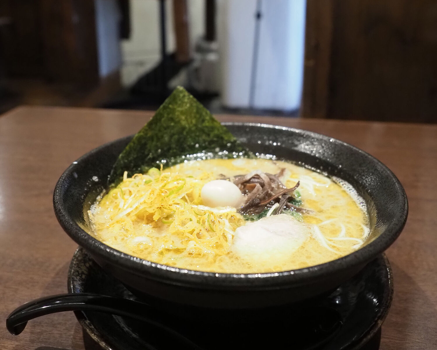 辛ネギは豆板醤や胡麻油などで和えたシャキッとした白髪ネギを想像していたのですが、こちらでは白髪ネギではなく小口切りされていることから少ししんなりとしていますね そして、ほうれん草やきくらげ、チャーシュー、うずら卵、海苔とトッピングされていまして…