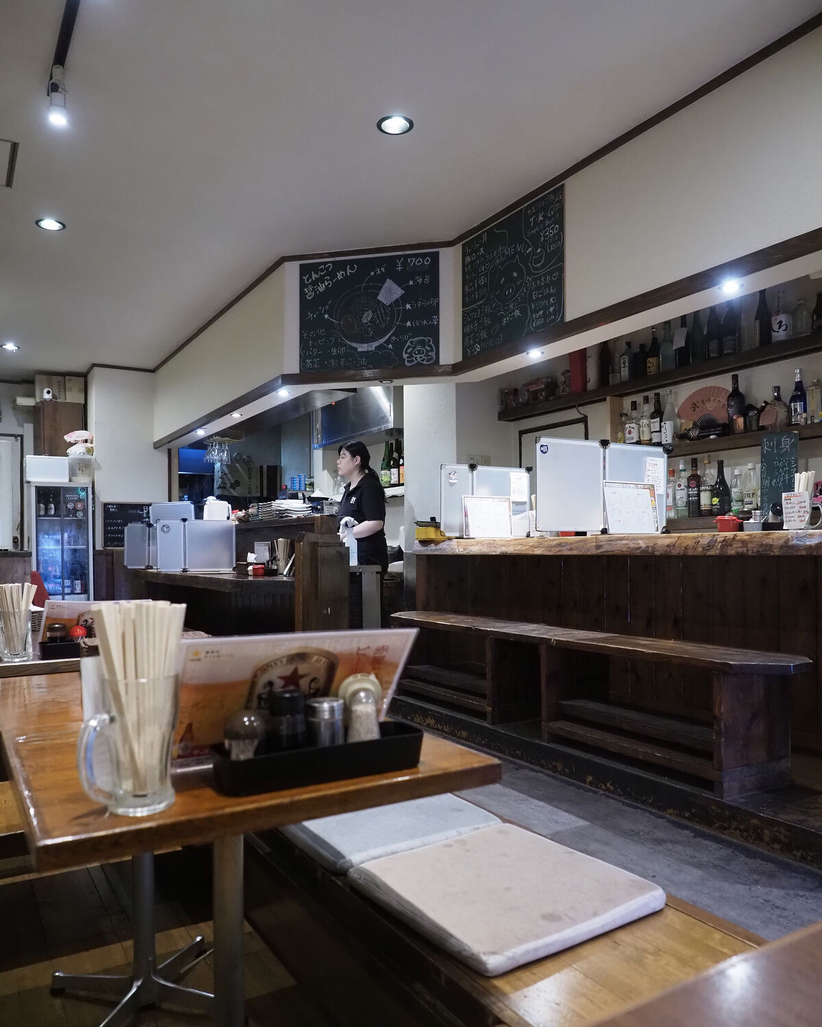 居酒屋感満載のお店は4~5名が掛けられる長椅子が2本並ぶカウンター席と4名掛けの座卓が3卓置かれる小上がり席、そしてその奥にもテーブル席が1卓あるようですね