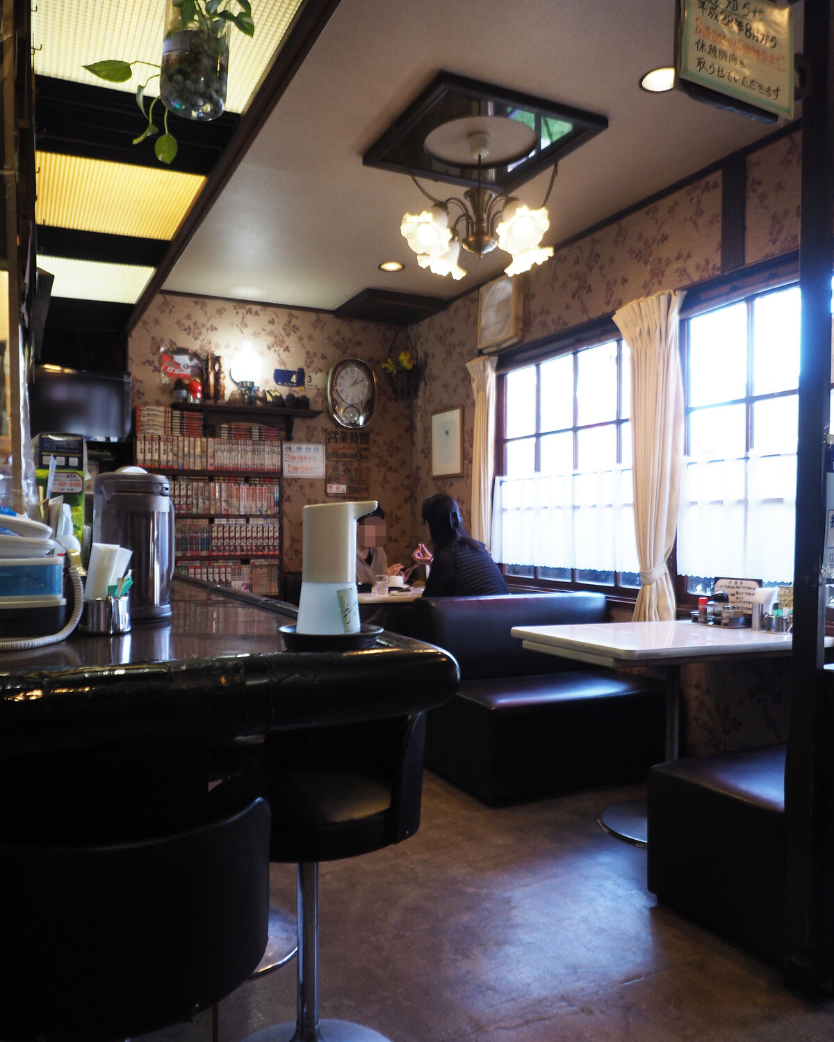 レースカーテンが付けられた昔懐かしい開き戸を開けた店内はカウンター8席とテーブル3卓10席と小ぢんまりとしていまして、明るく優しさを感じる奥さまに迎えていただけます