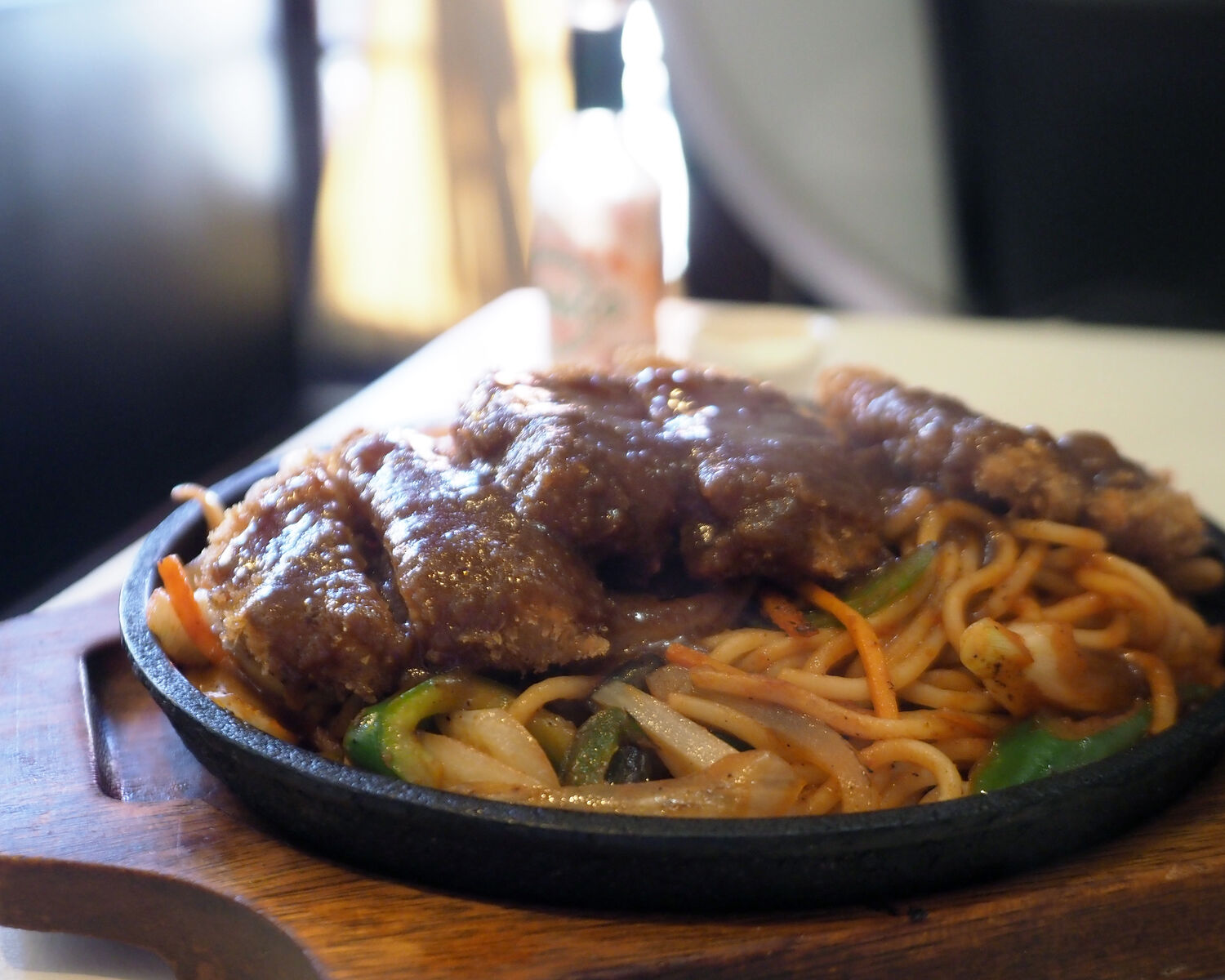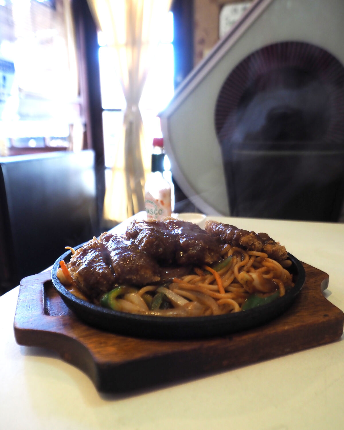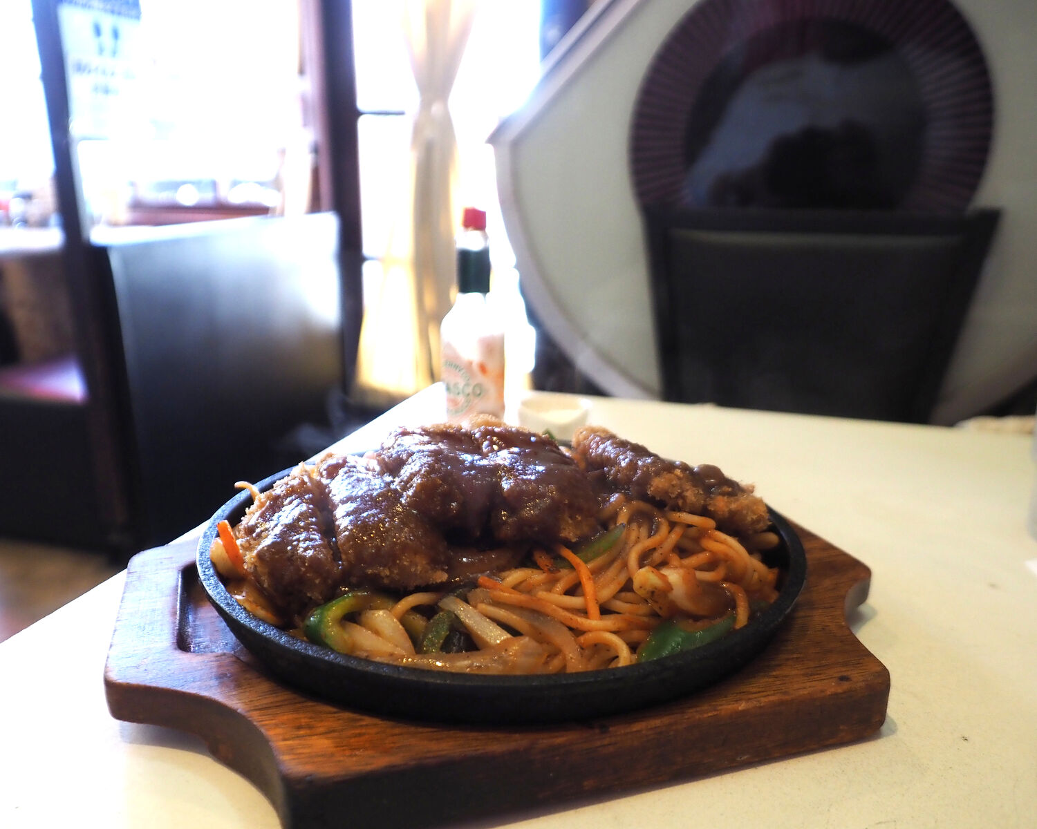 熱々の鉄板に盛られた懐かしのナポリタンに薄切りのとんかつが載せられたボリュームある一品でありまして…