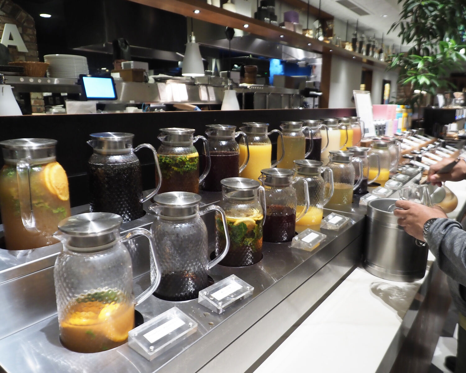 多くのお店のドリンクバーにある炭酸飲料を中心としたディスペンサーではなく、フレッシュとは言わないまでもちゃんと果汁が入っているであろうジュースや紅茶、コーヒーなど40種以上が並び高級ホテルのビュッフェでいただくドリンクバーにも負けない感じであります