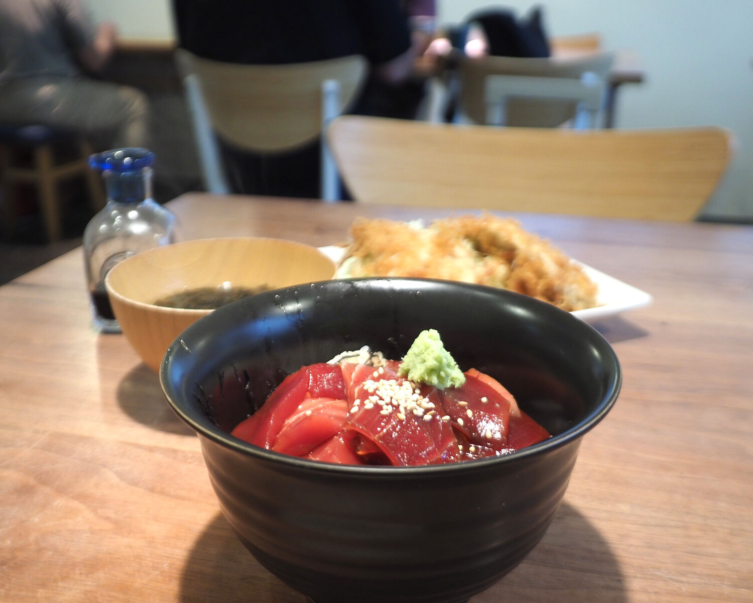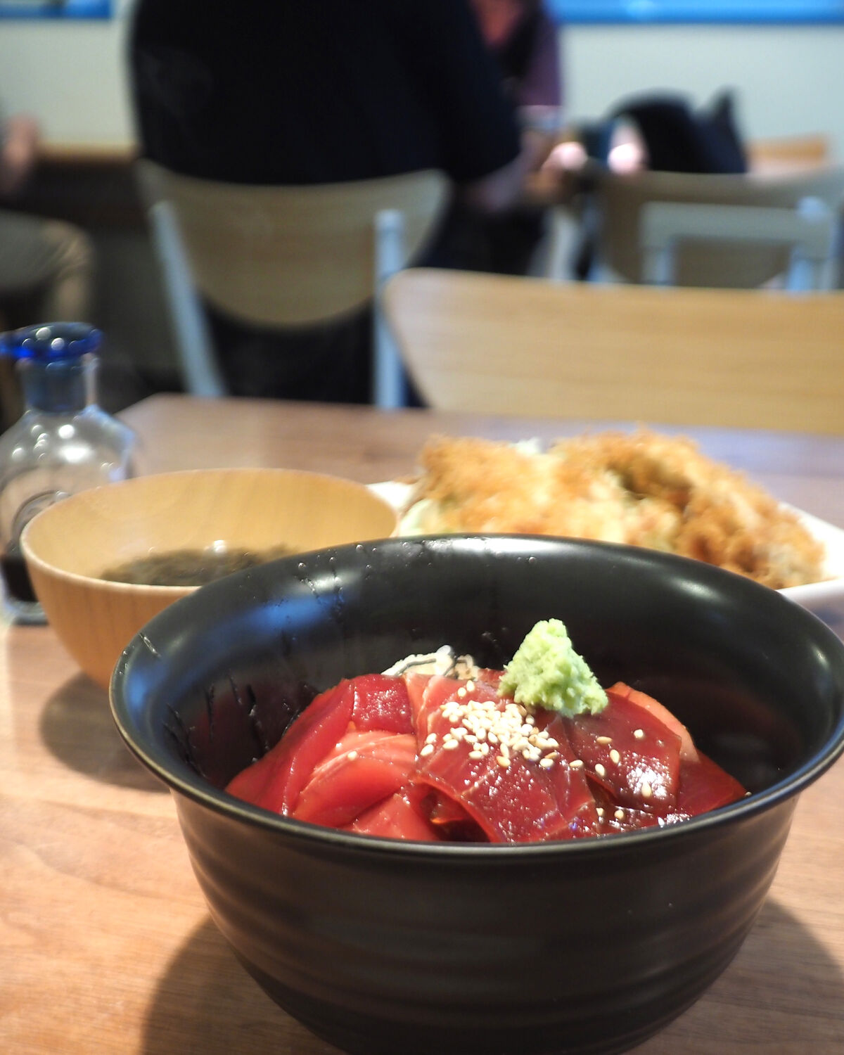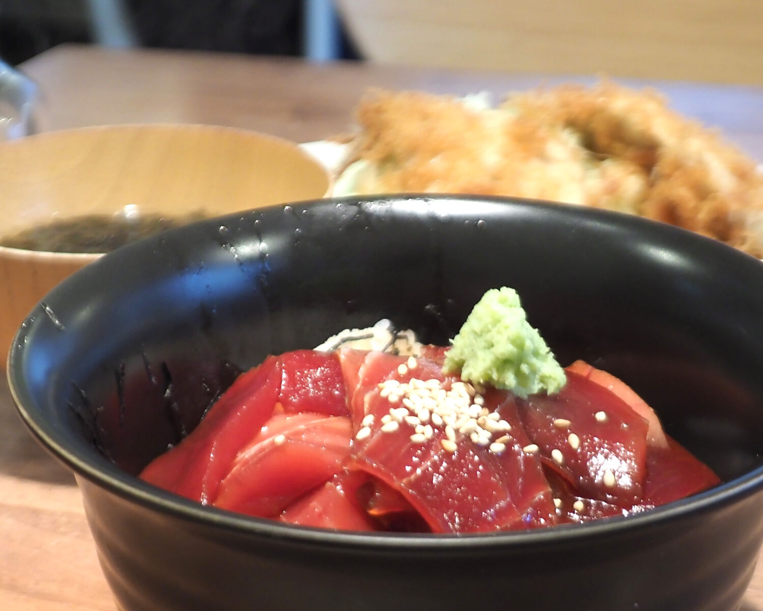 「天然 鮪漬け丼セット」をいただき、生鮪らしさを感じるねっとりとした舌ざわりと、サクサクでふっくらと揚がったアジフライに満足であります