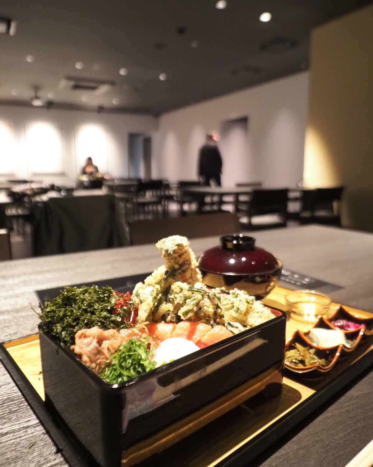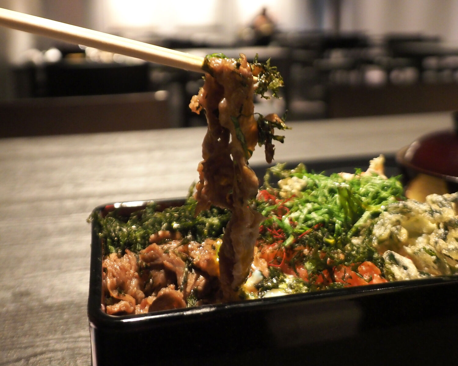 明太子発祥とされる『ふくや』の明太子をメインに有明の焼きバラ海苔、そしてそのバラ海苔の天ぷらが載る「めんたい三昧御膳」に“和牛のせ”を追加し満足なお昼でありました