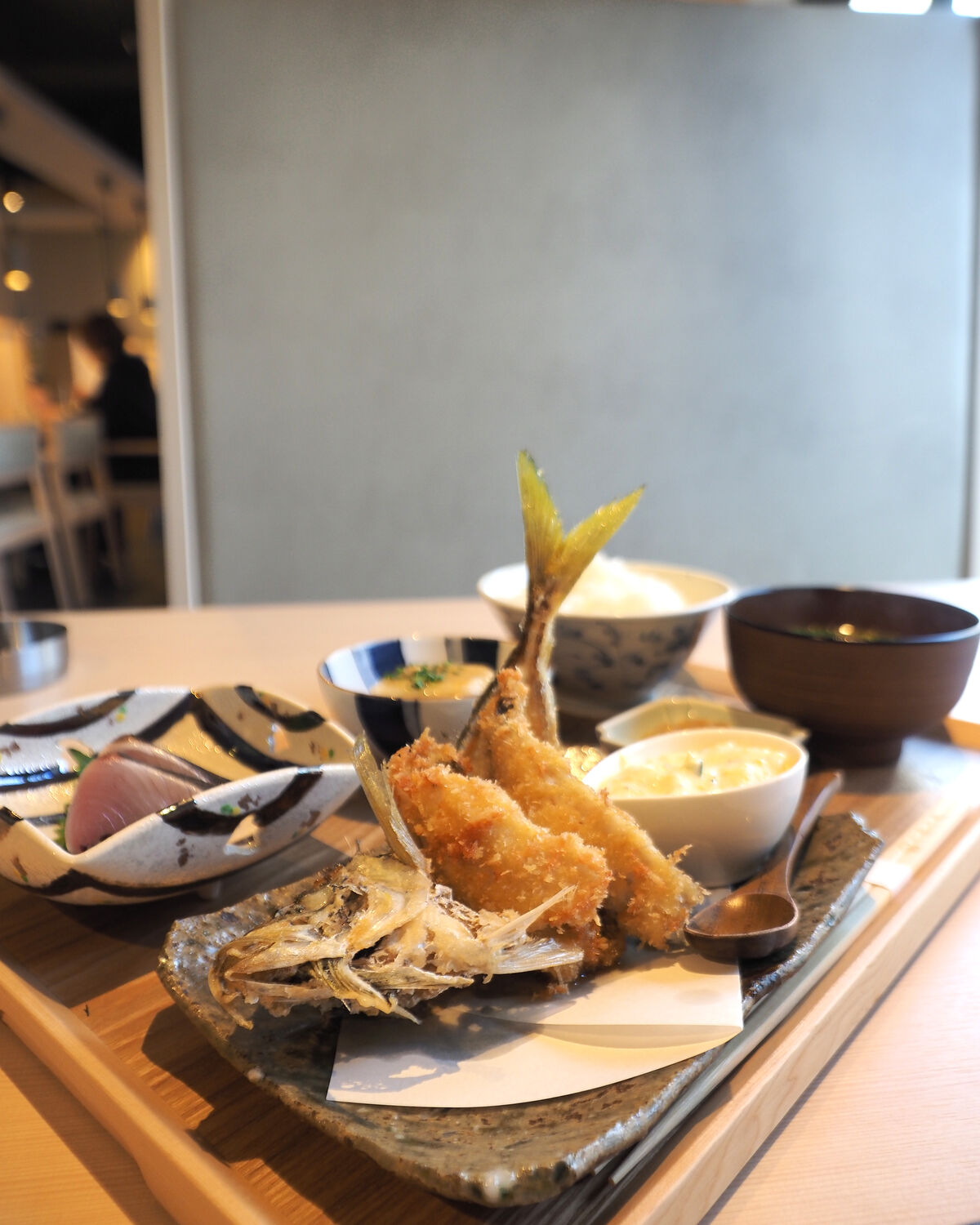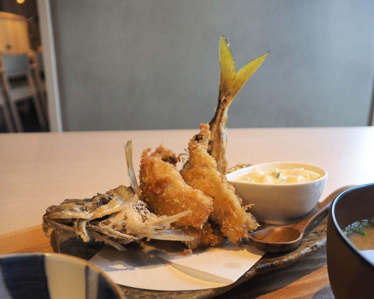 因幡うどんなどがある三角市場近くにオープンされた『十魚十色』でいただいた活あじフライはふっくらとしていてサックサク、骨までおいしくいただけました