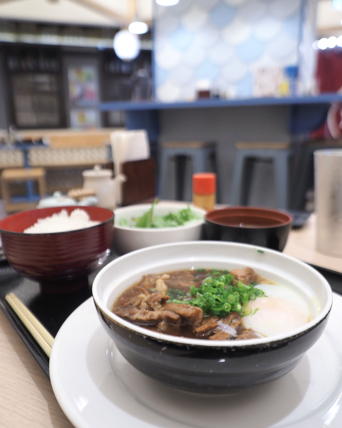 肉と魚とのコンセプトの通り、赤身サーロインステーキセットやランチハンバーグセットなど11種の肉料理と、天ぷら刺身ご膳や特選海鮮丼など7種の魚料理が用意されるお昼のメニューから「牛すじ煮込みご膳」をいただきました