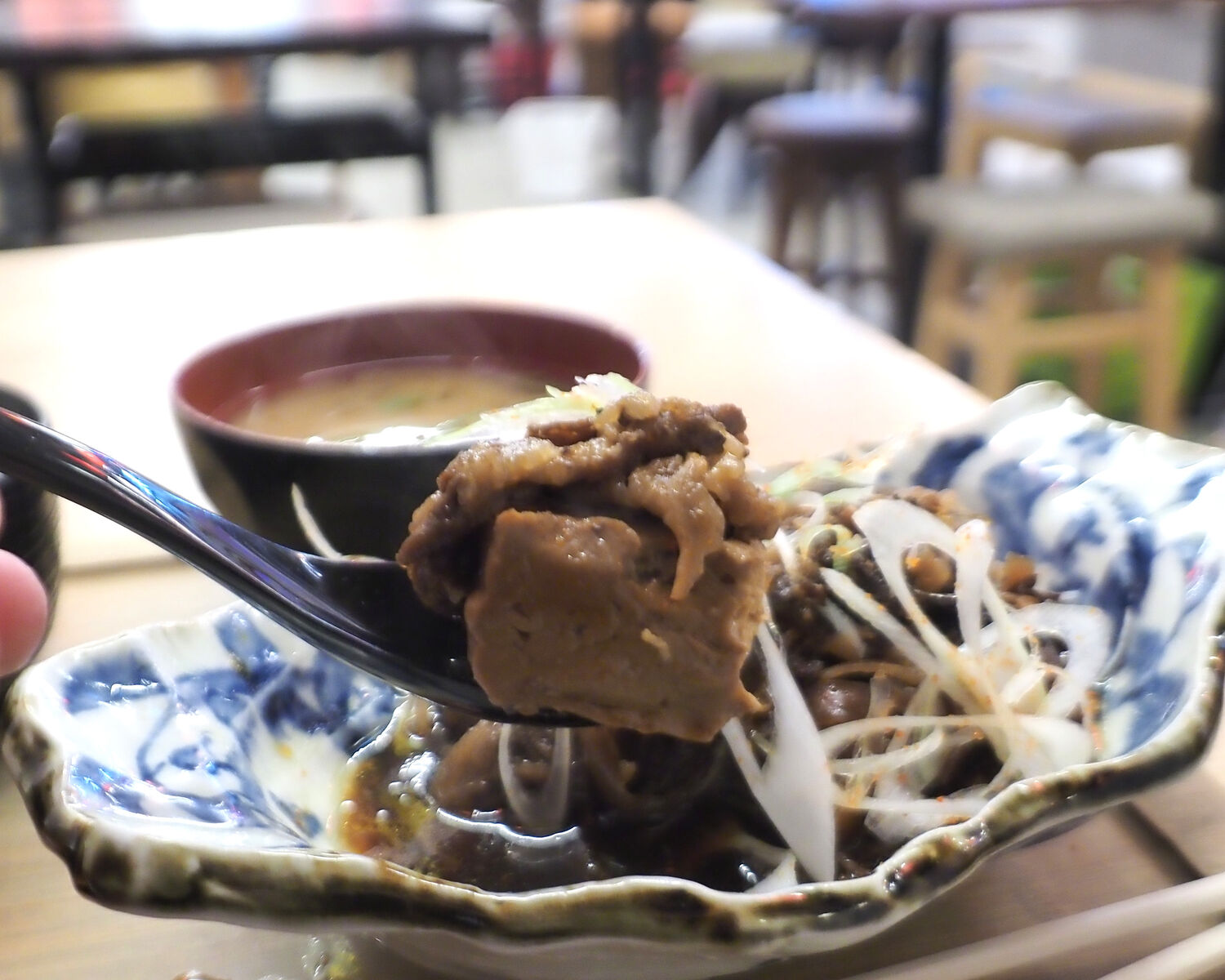 しっかりと水切りされた木綿豆腐には表面だけでなく芯まで真っ黒になるほどに割り下が染みていますし、そのお豆腐の上に乗せられた牛肉は柔らかく煮込まれていまして…
