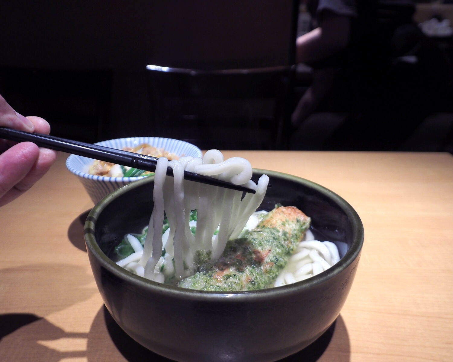 鰹節や昆布に加えてウルメイワシや鯖節を使ってとる透き通った上品なおつゆと、少しコシを感じるおうどんでありまして…