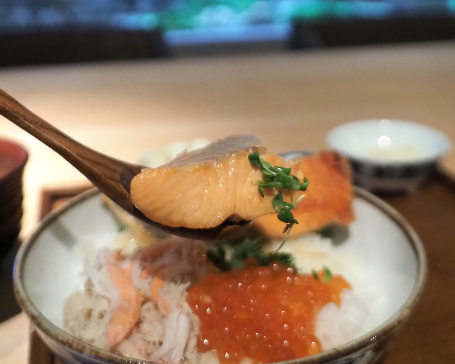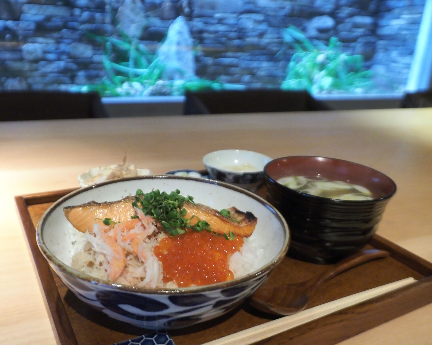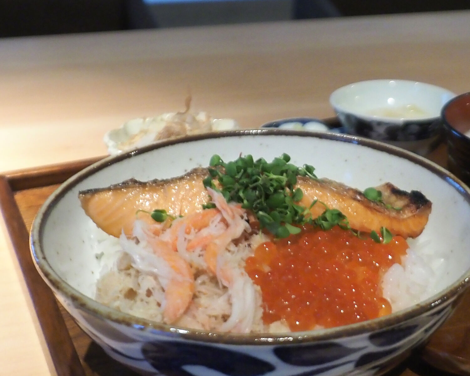 当初はなかったものの、おいしいサーモンが見つかったからとメニューに加えられたと言う「焼鮭定食」にも惹かれますが、せっかくなので全てがいただける「焼鮭かにいくら丼」を選びます