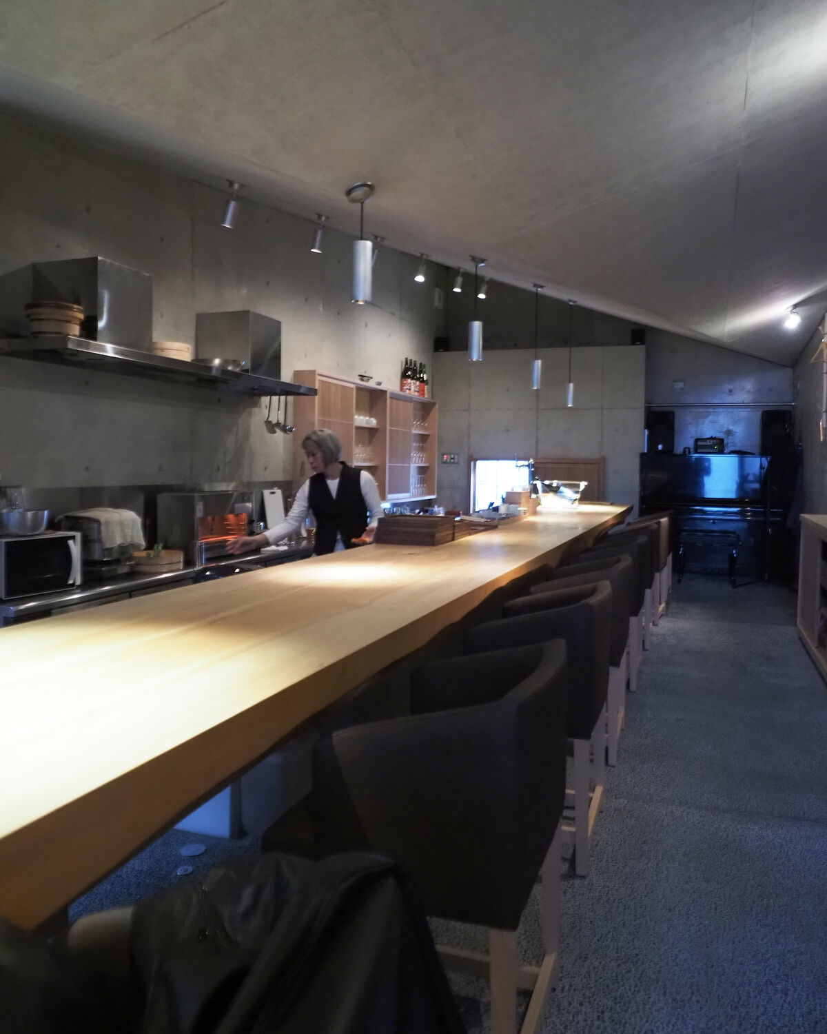コンクリートが打ちっ放しとなった無機質な店内には12席ほどが並ぶ一枚板のカウンターに温もりが感じられますし、8人ほどが入れそうな半個室も良い感じでありました