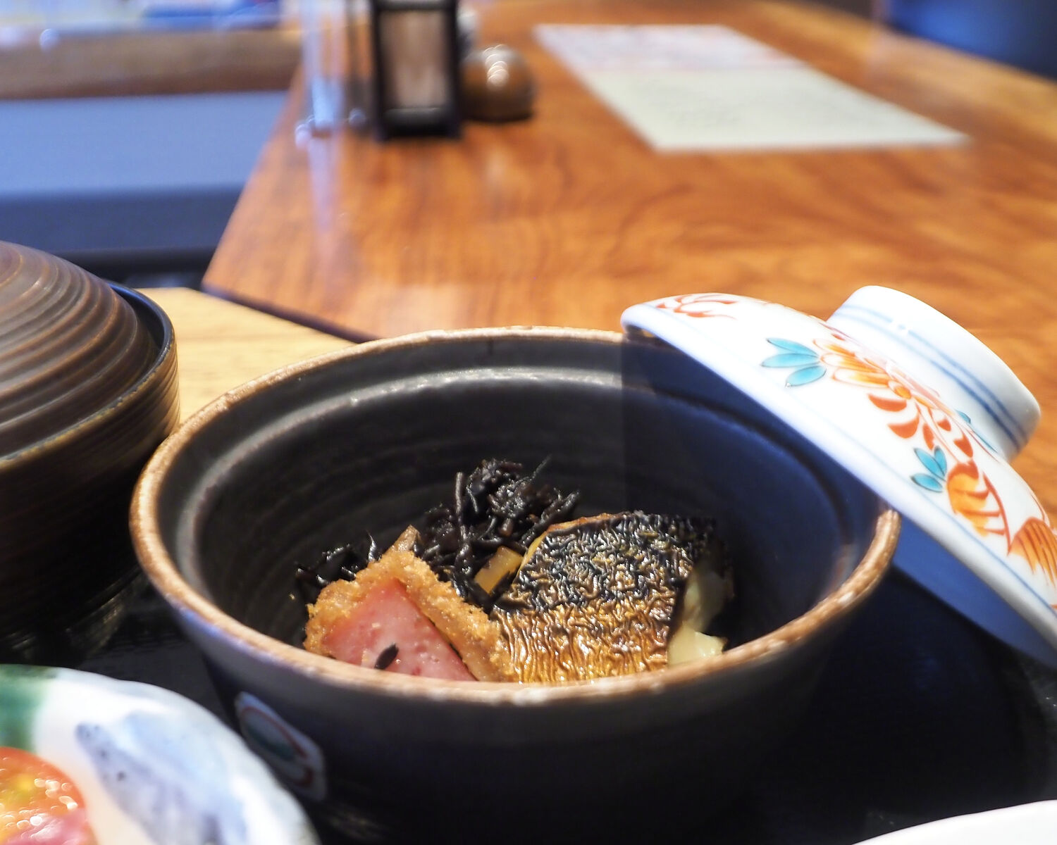 身が締まることはなくふっくらと煮付けられているにもかかわらずしっかりと味が染みていますし、ひじきの煮ものにハムカツ、塩サバと入った椀物もあって…