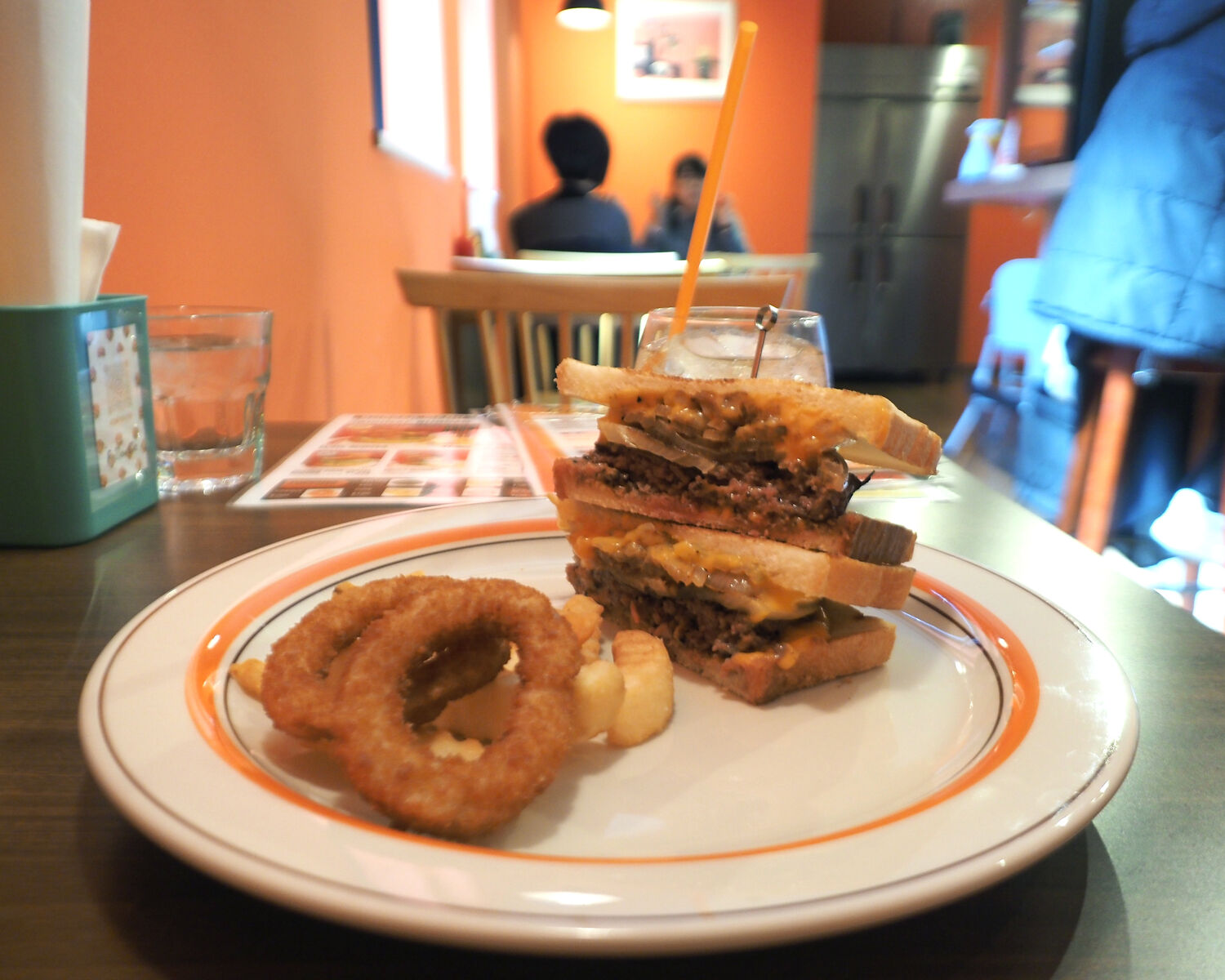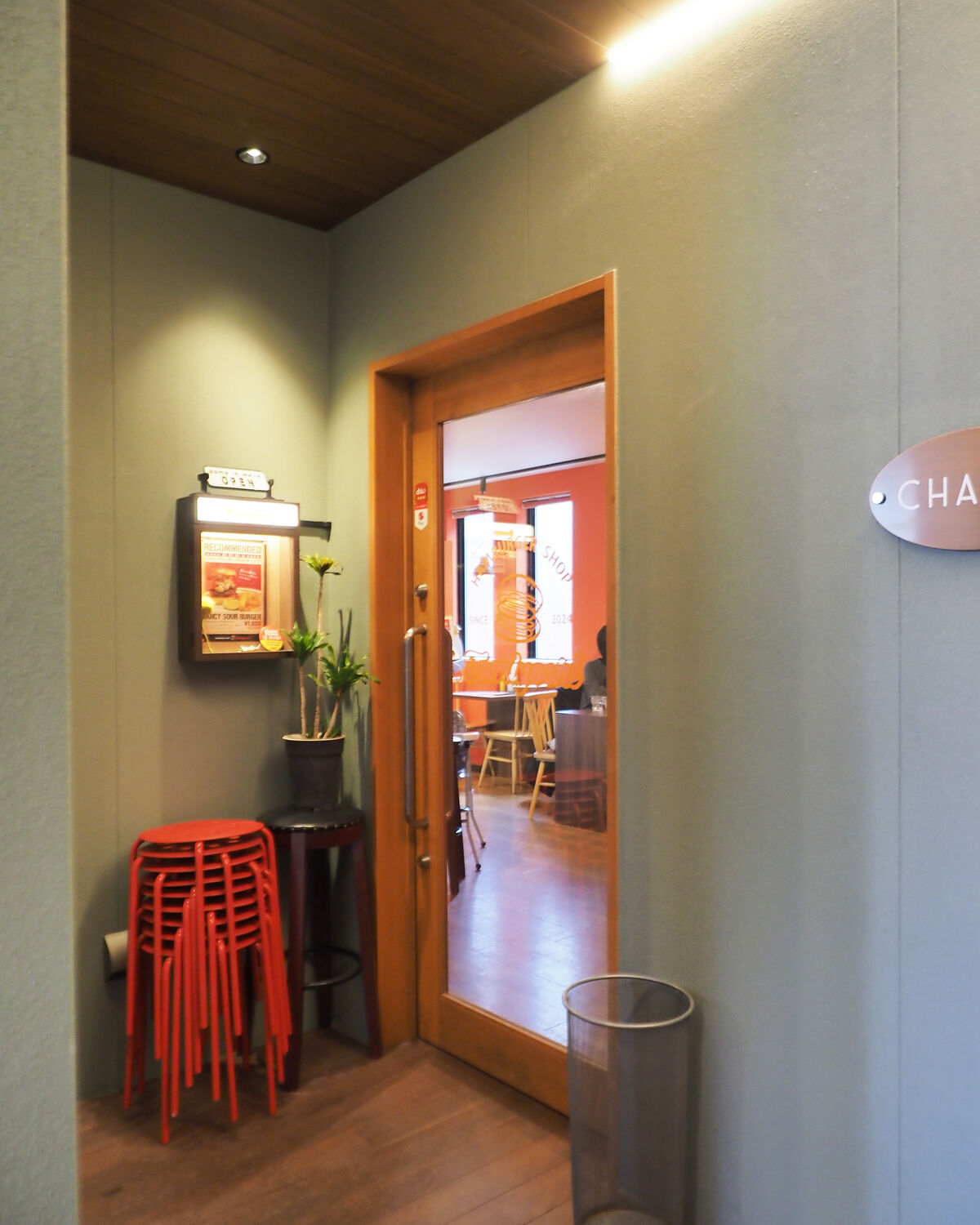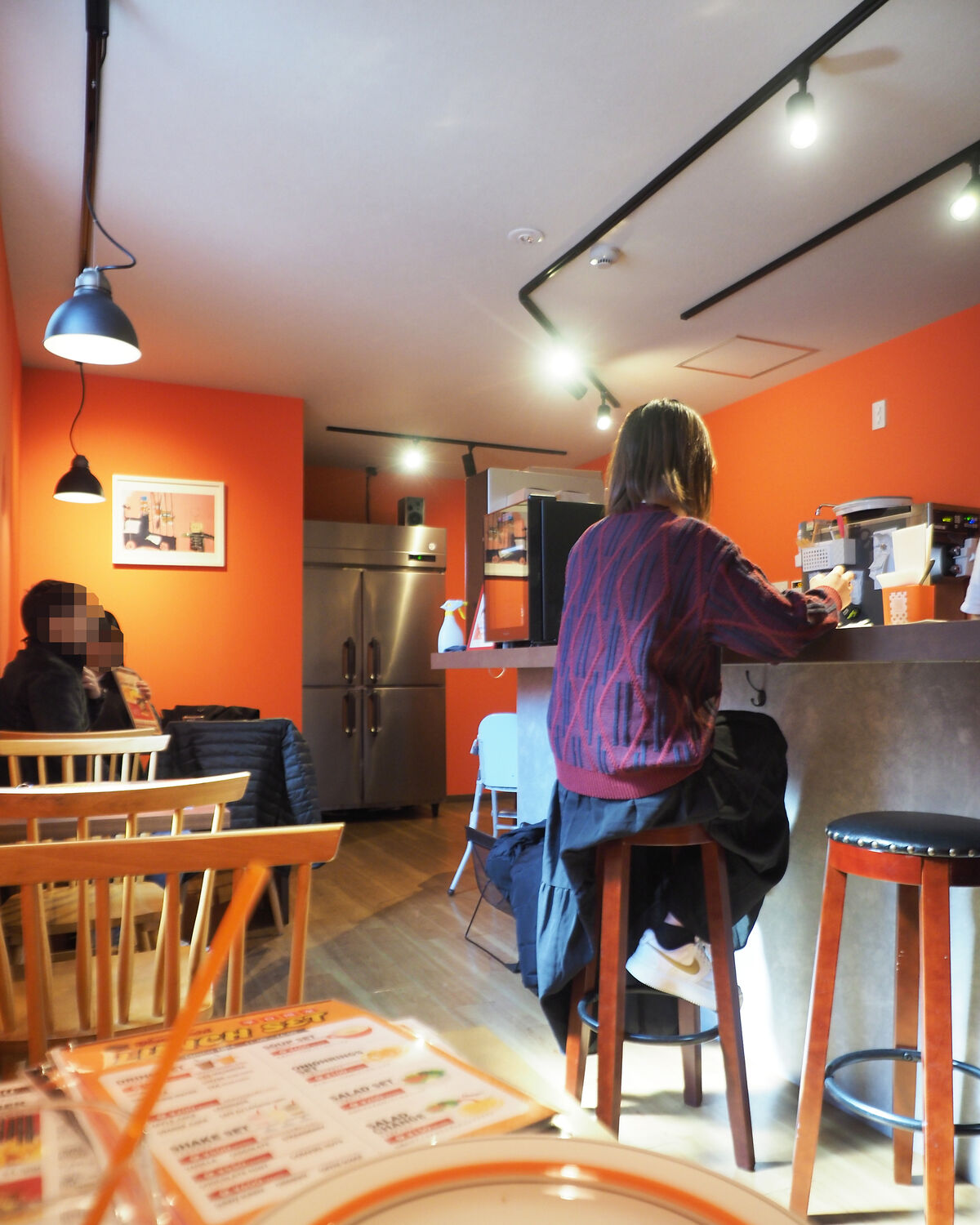 お邪魔した『HAMBURGER SHOP 富吉』も前店舗であるカフェバーの3卓8席のテーブル席とカウンター5席が置かれる造作はそのままに壁面にはブランドカラーであるオレンジが塗られていました